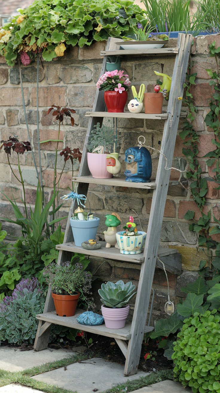 Repurpose an old wooden ladder as a tiered plant stand. Sand it down and paint it in a color that complements your garden. Use each step to display potted plants, lanterns, or garden ornaments. Add a touch of whimsy with small fairy lights draped around the ladder.