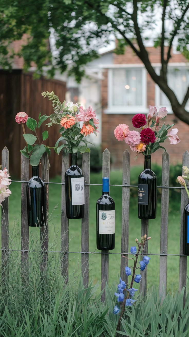 Upcycle empty wine bottles into chic vases for fresh-cut flowers. Attach the bottles to a garden fence with sturdy metal clamps. This eco-friendly decoration adds a touch of sophistication to your space while showcasing seasonal blooms.