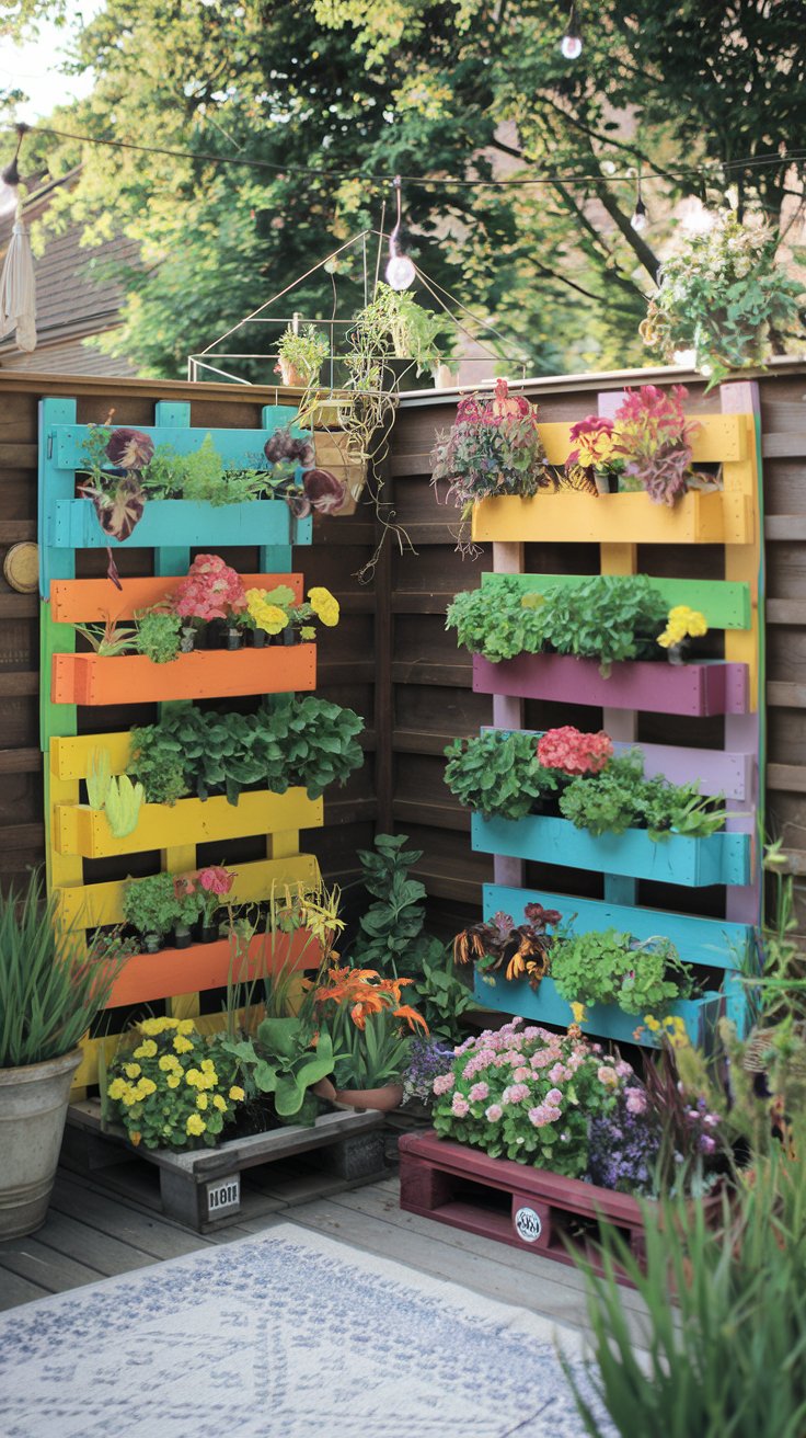 Turn an old wooden pallet into a vertical garden bursting with life. Paint it in vibrant colors and fill the slots with pots of herbs, flowers, or succulents. Secure the pots with strong hooks and use contrasting hues for a bold effect. Place it against a wall to save space while adding greenery.