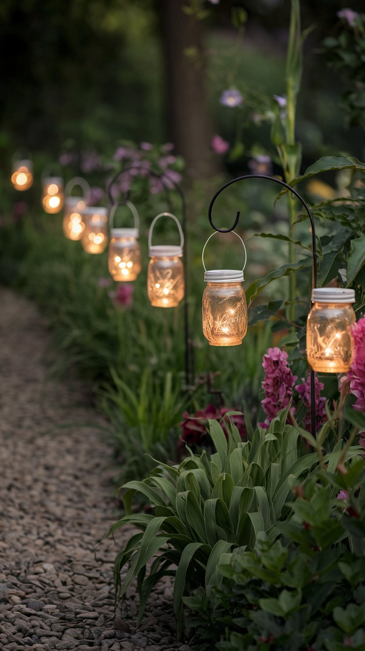 Create a romantic garden path with mason jars filled with LED candles or string lights. Hang them on shepherd hooks or place them directly along the walkway. Use frosted jars for a soft, diffused glow that enhances the cozy atmosphere.