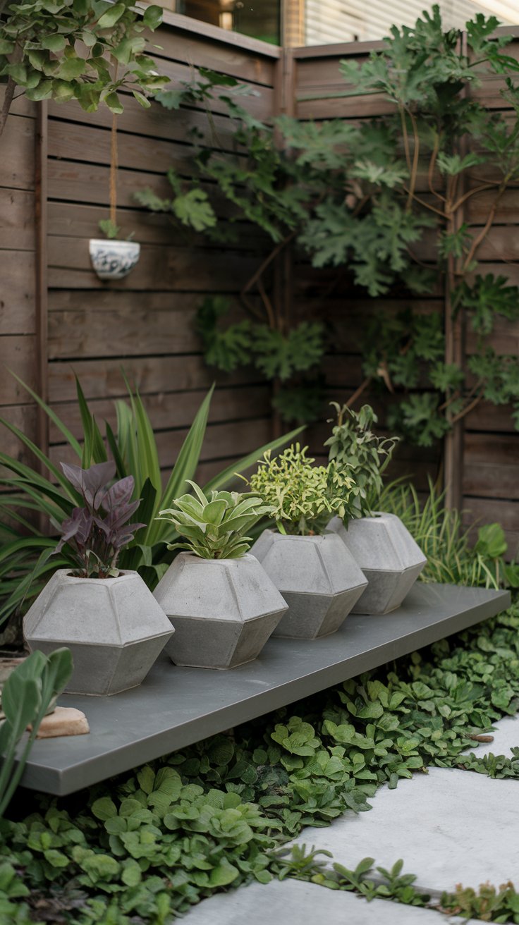 Make sleek geometric planters from quick-set concrete and silicone molds. Arrange them on a table surrounded by greenery for a modern, minimalist look. Paint the planters in metallic tones for extra style.
