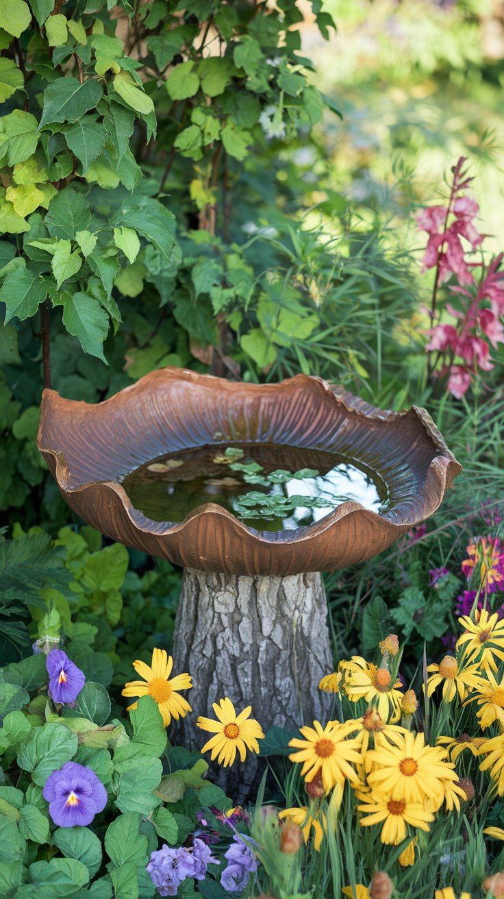 Create a natural-looking birdbath using a large leaf mold and quick-dry cement. Place it among vibrant flowers to attract birds and add movement to your garden. Use a banana or rhubarb leaf for dramatic texture and size.
