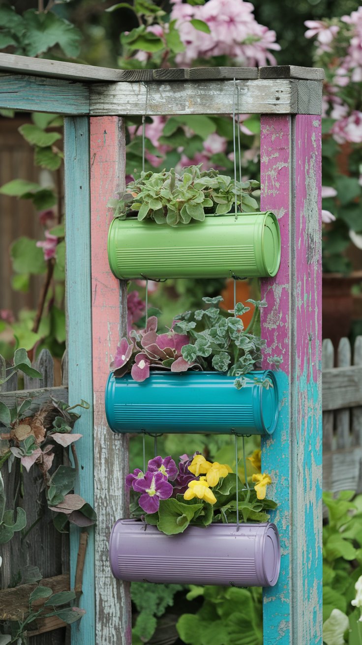 Upcycle tin cans by painting them in cheerful pastel shades and hanging them on a wooden frame. Add drainage holes to the cans and plant hardy flowers or herbs. This compact display brightens up a dull corner and keeps plants at eye level for easy watering.