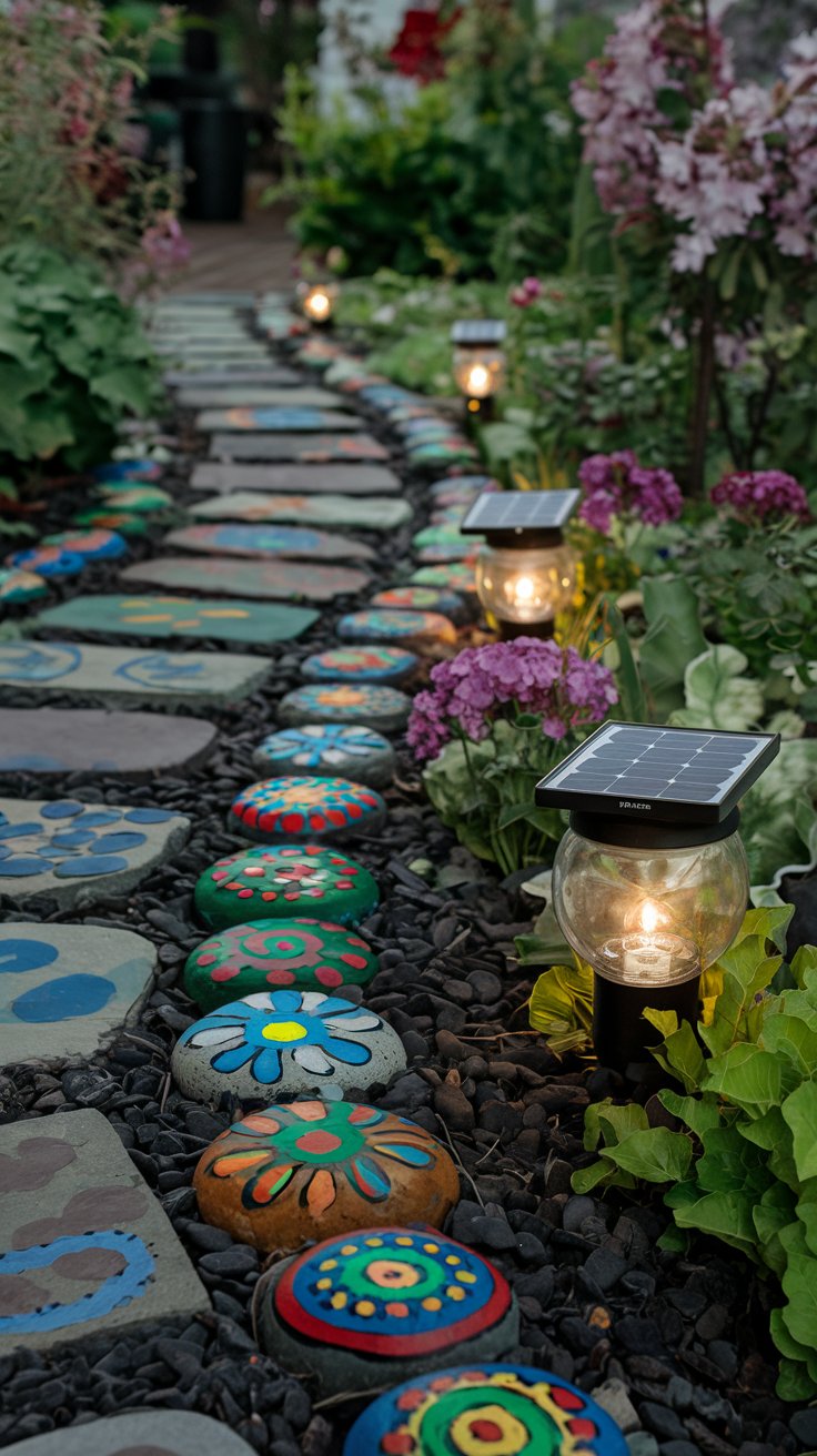 Line your garden path with hand-painted river stones in bright, cheerful patterns. Add solar-powered lanterns along the edges for illumination at night. Use non-toxic outdoor paints to ensure your artwork lasts through the seasons.