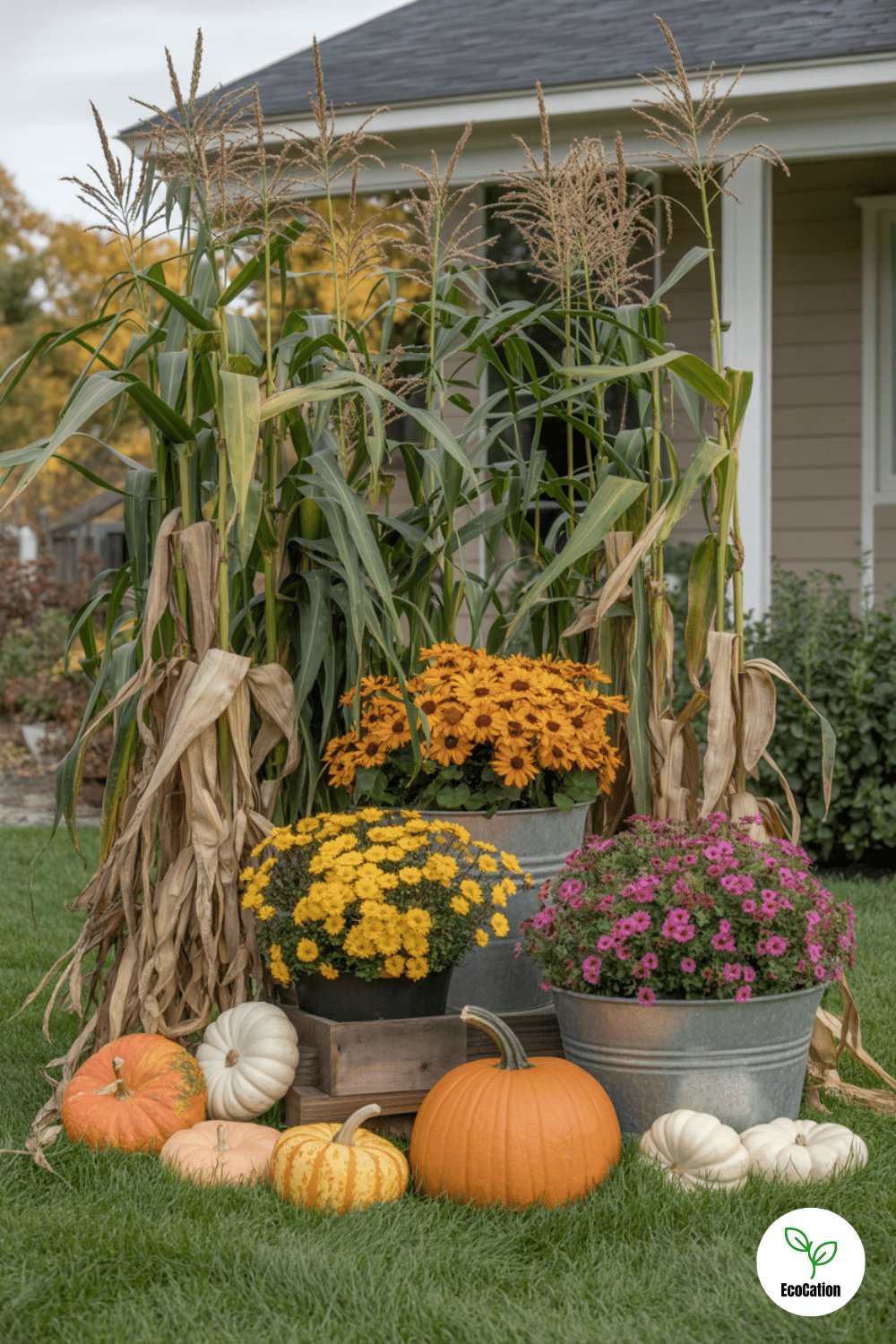 Mix corn stalks, pumpkins, and fall flowers for a festive backyard display. It s a playful, seasonal way to celebrate autumn traditions. Secure the corn stalks with twine to keep them standing tall through windy days.