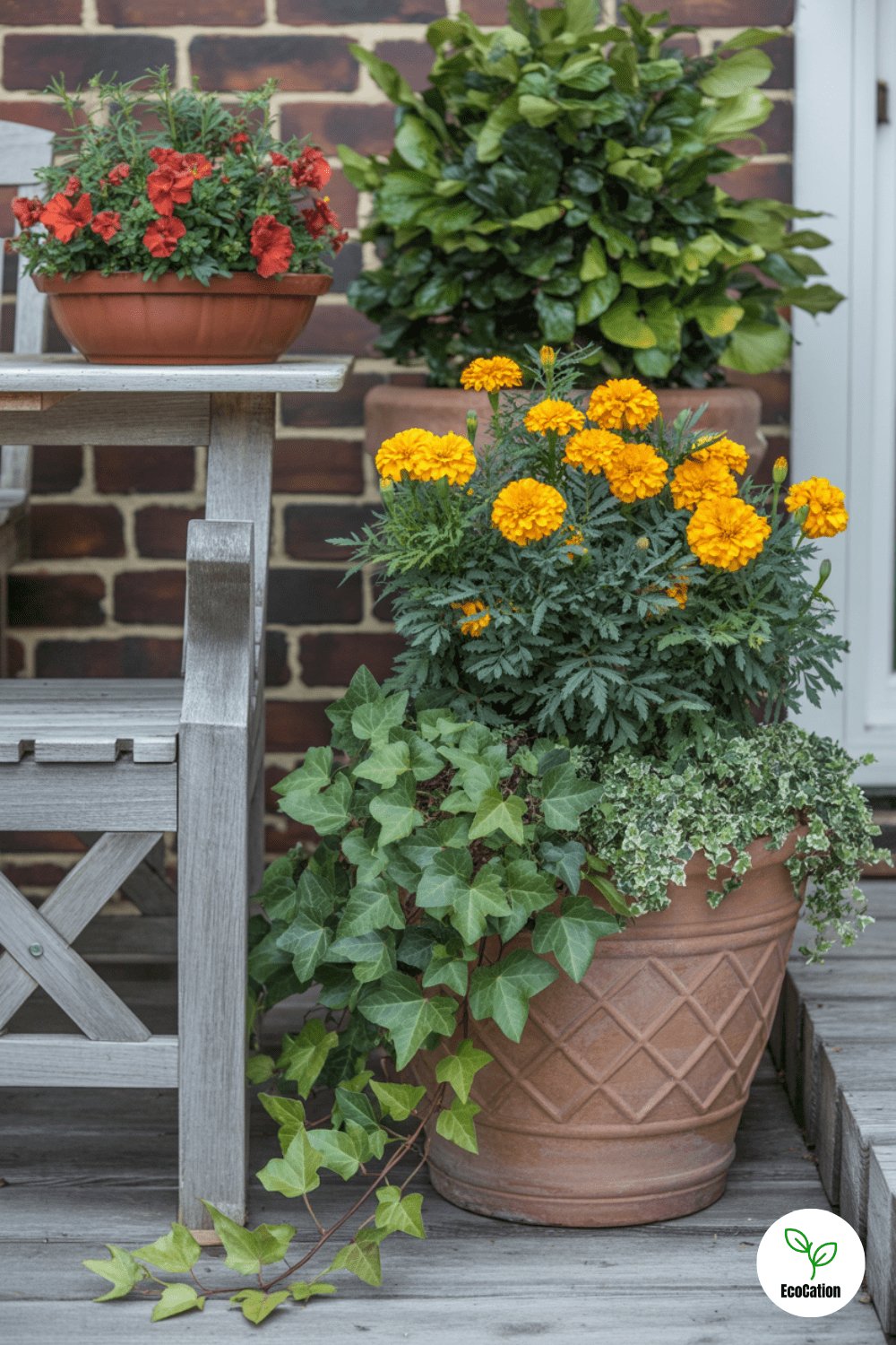 Let ivy and marigolds spill over large patio containers for an elegant, layered look. This setup works especially well near seating areas. Use trailing plants at the edges to make the arrangement feel fuller.