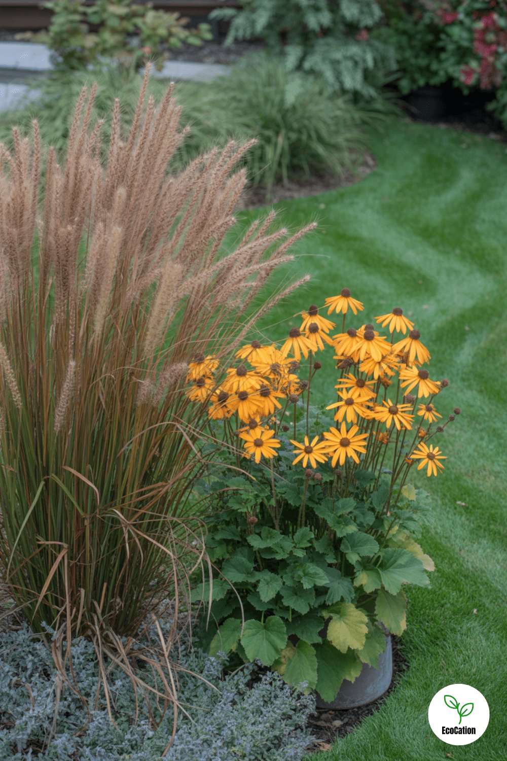 Pairing autumn flowers with tall ornamental grasses brings natural texture and flow to your landscaping. The movement of the grasses against the vibrant blooms creates a stunning seasonal accent. Try placing them near fences or borders for the best effect.