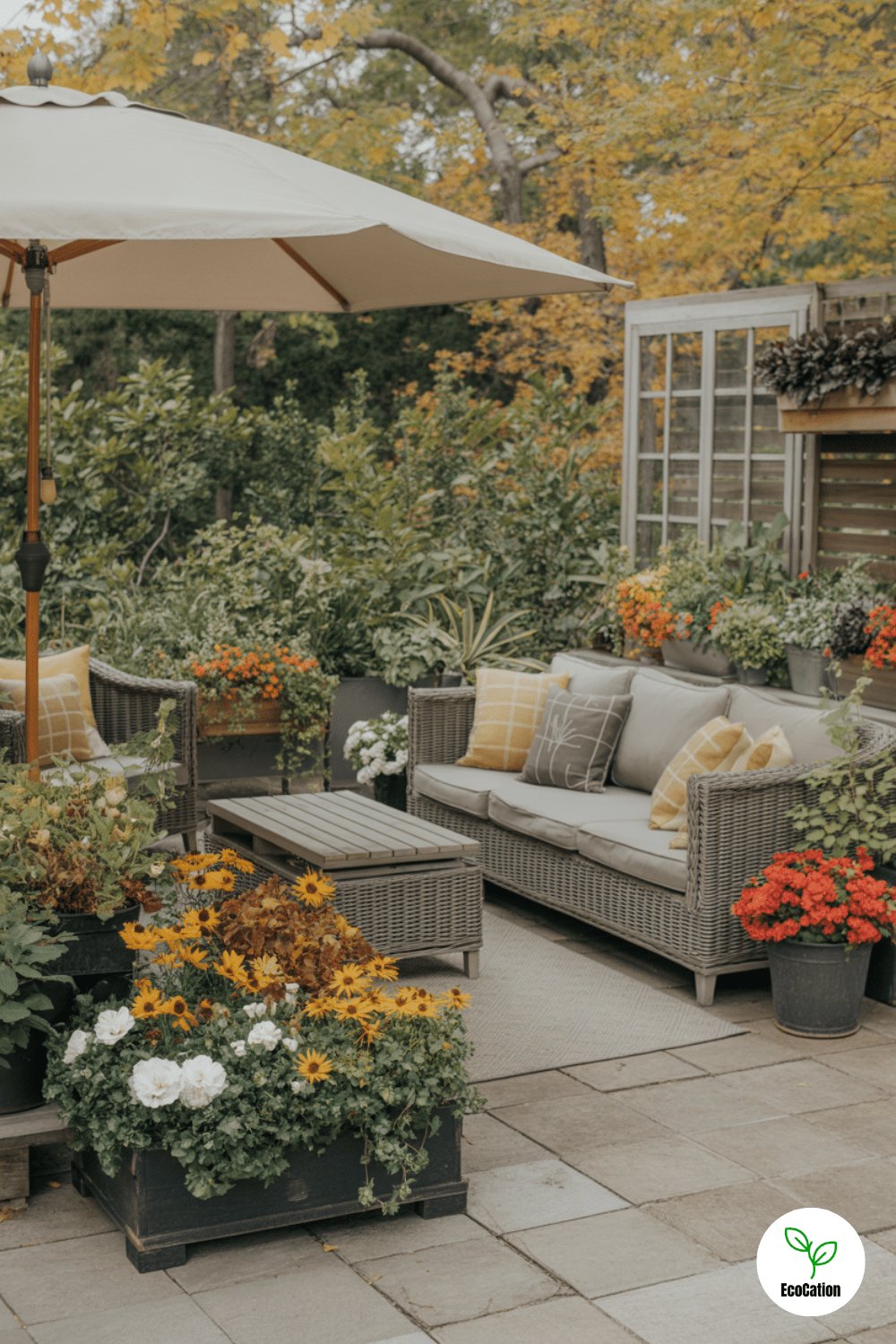 Turn your patio into an autumn oasis by surrounding your seating area with colorful fall planters. Think of it as building your own garden room outdoors. Add a cozy blanket and string lights for the ultimate seasonal vibe.