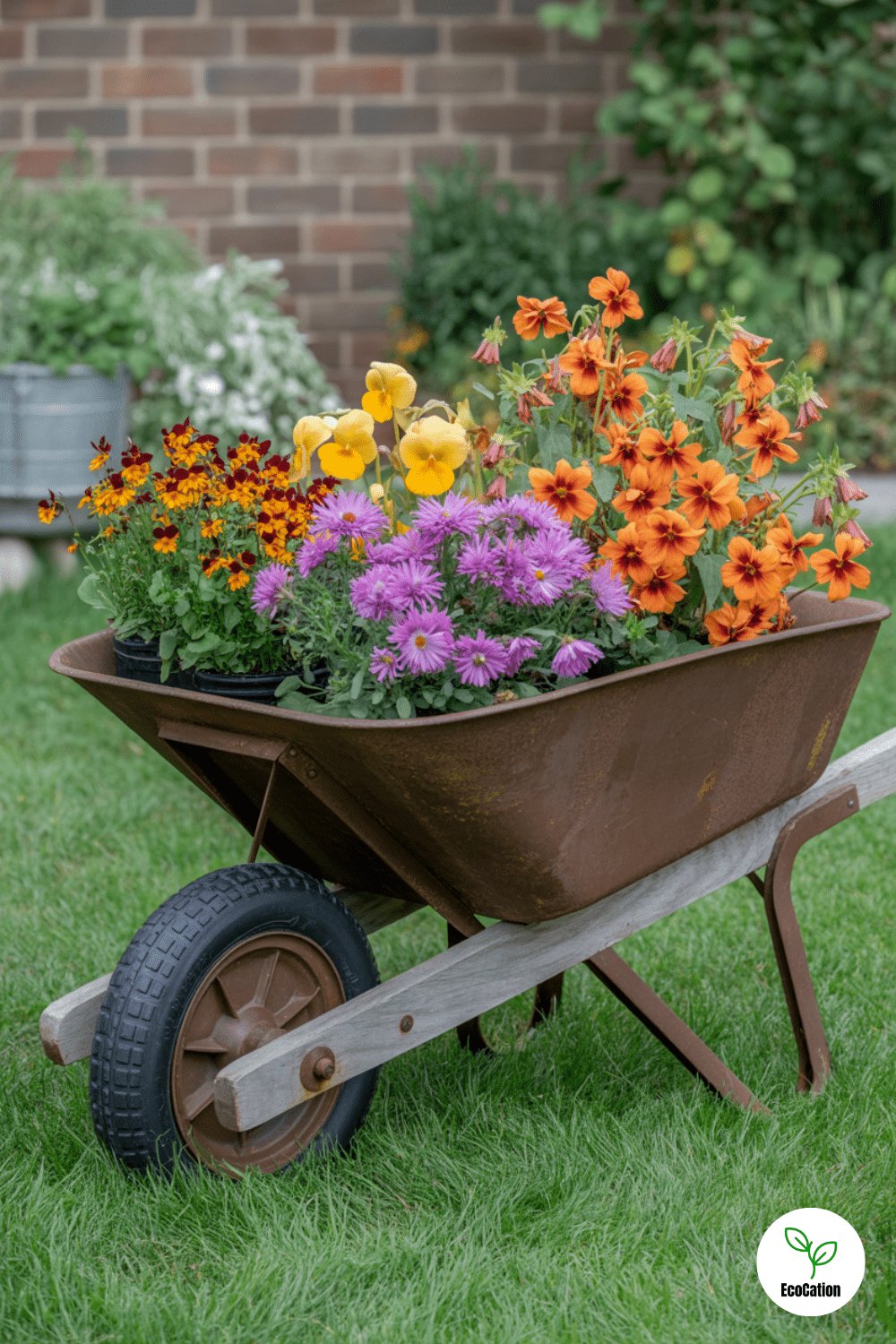 A rustic wheelbarrow overflowing with asters and pansies makes a whimsical garden focal point. It s easy to move around and perfect for seasonal displays. Line it with burlap before planting to hold the soil in place.