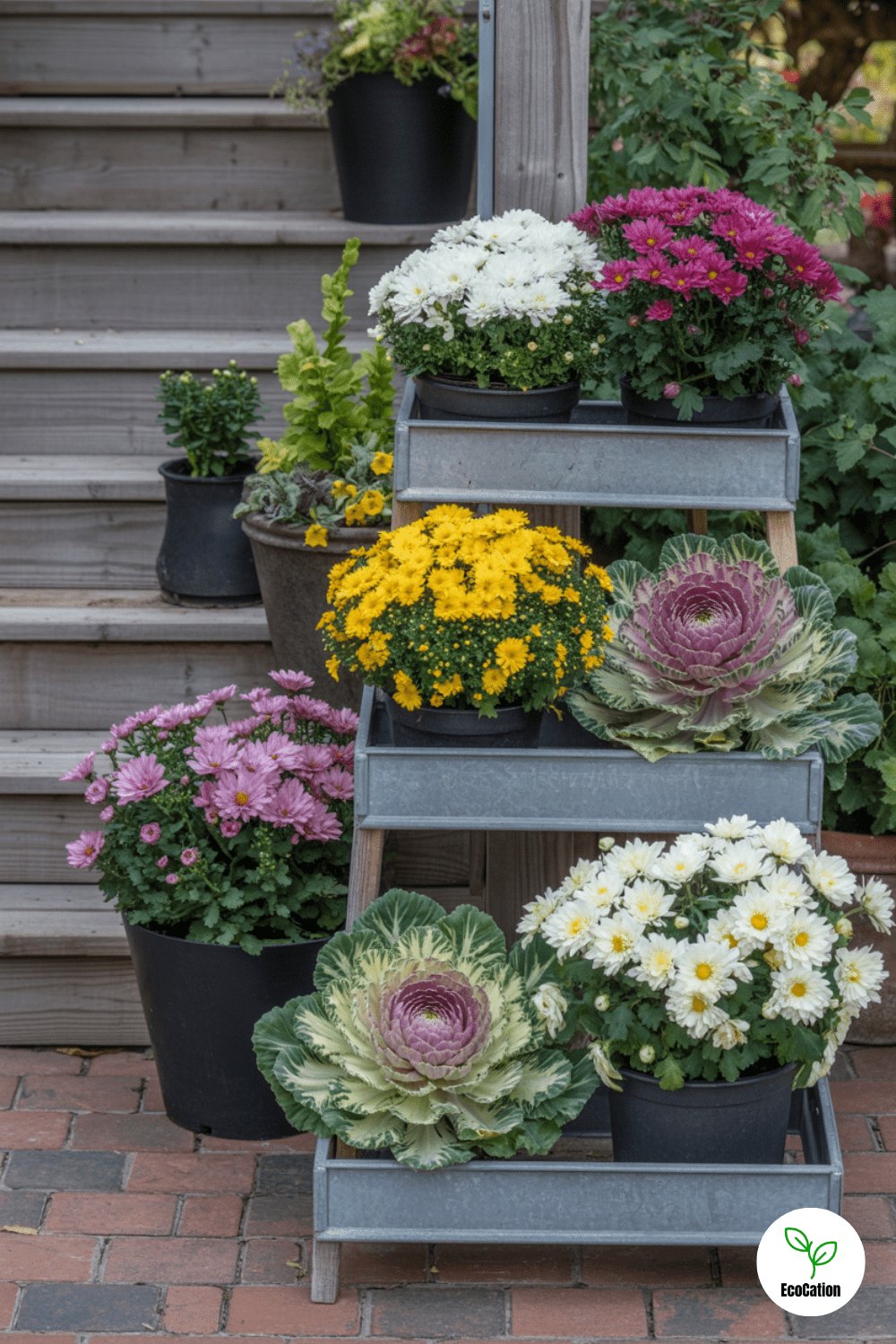 Stack chrysanthemums and ornamental cabbages in tiered pots for a layered autumn display. This adds visual interest and variety without needing much ground space. Use contrasting colors to make each level stand out.