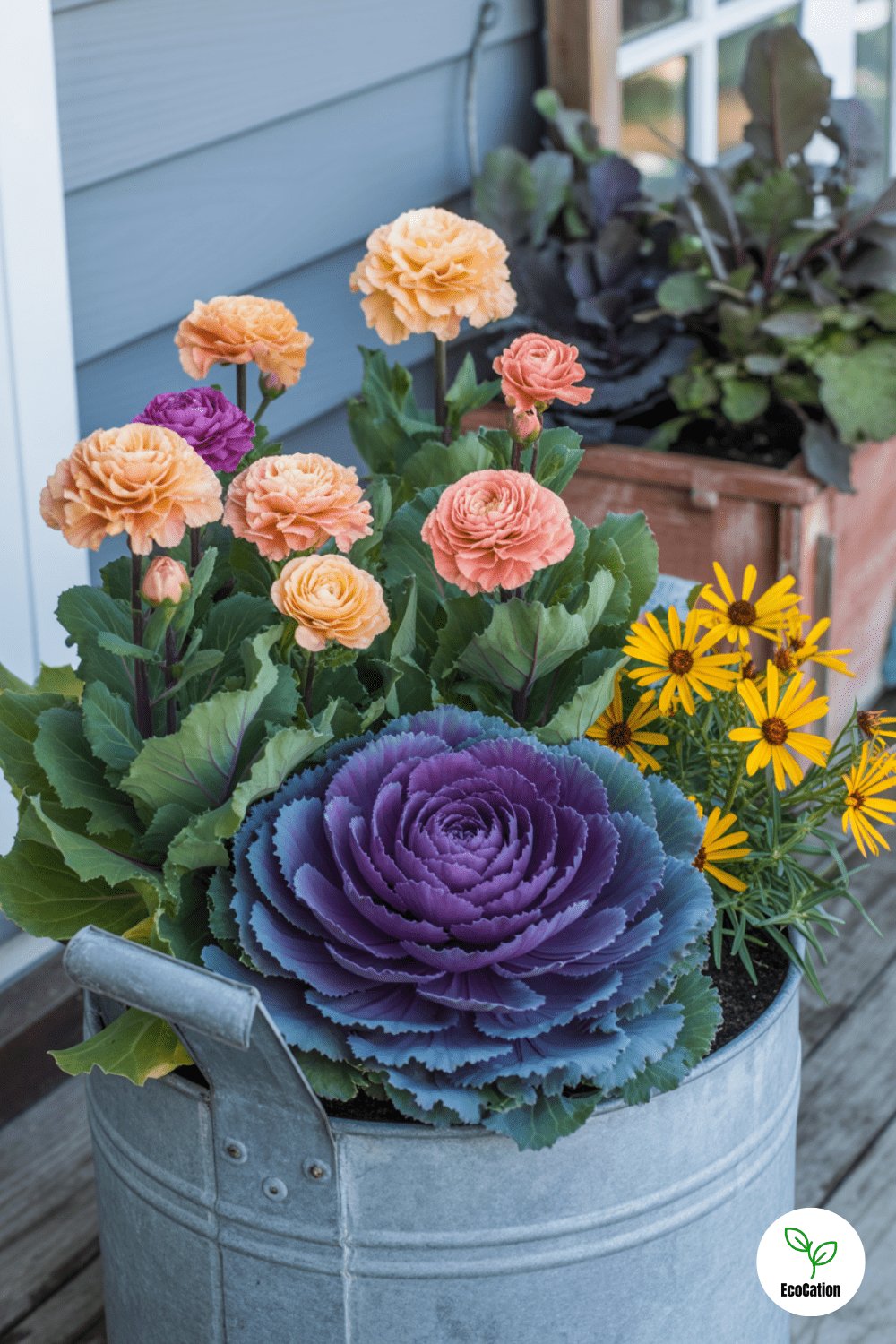 Mixing deep purple ornamental kale with fall garden flowers in a rustic planter is the perfect way to add instant porch charm. The contrast of leafy textures with bright blooms creates a cozy fall feel. Place the planter near your door to greet guests with seasonal warmth.