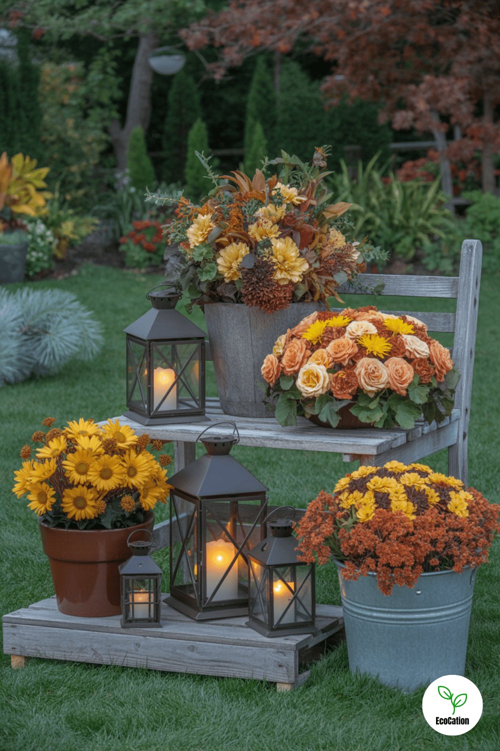 Mix lanterns with autumn flower pots for a warm, inviting evening setup. As the sun sets, the glow of lanterns brings your blooms to life. Use battery-operated candles to keep it safe and easy.