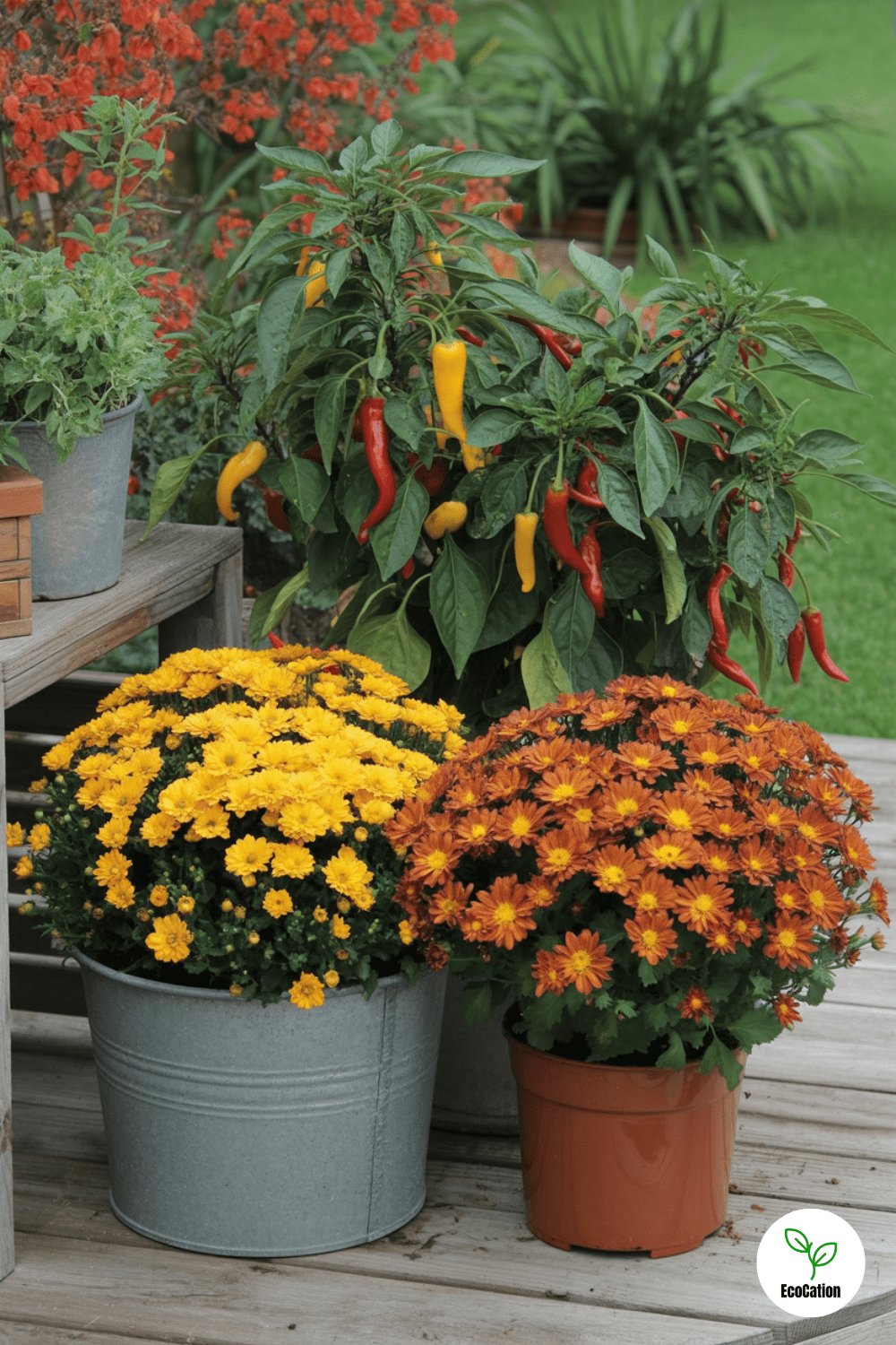 Pair orange mums with ornamental peppers for a striking autumn arrangement. The fiery tones will brighten up any corner of your garden. Place them in sunny spots to keep the peppers vibrant.