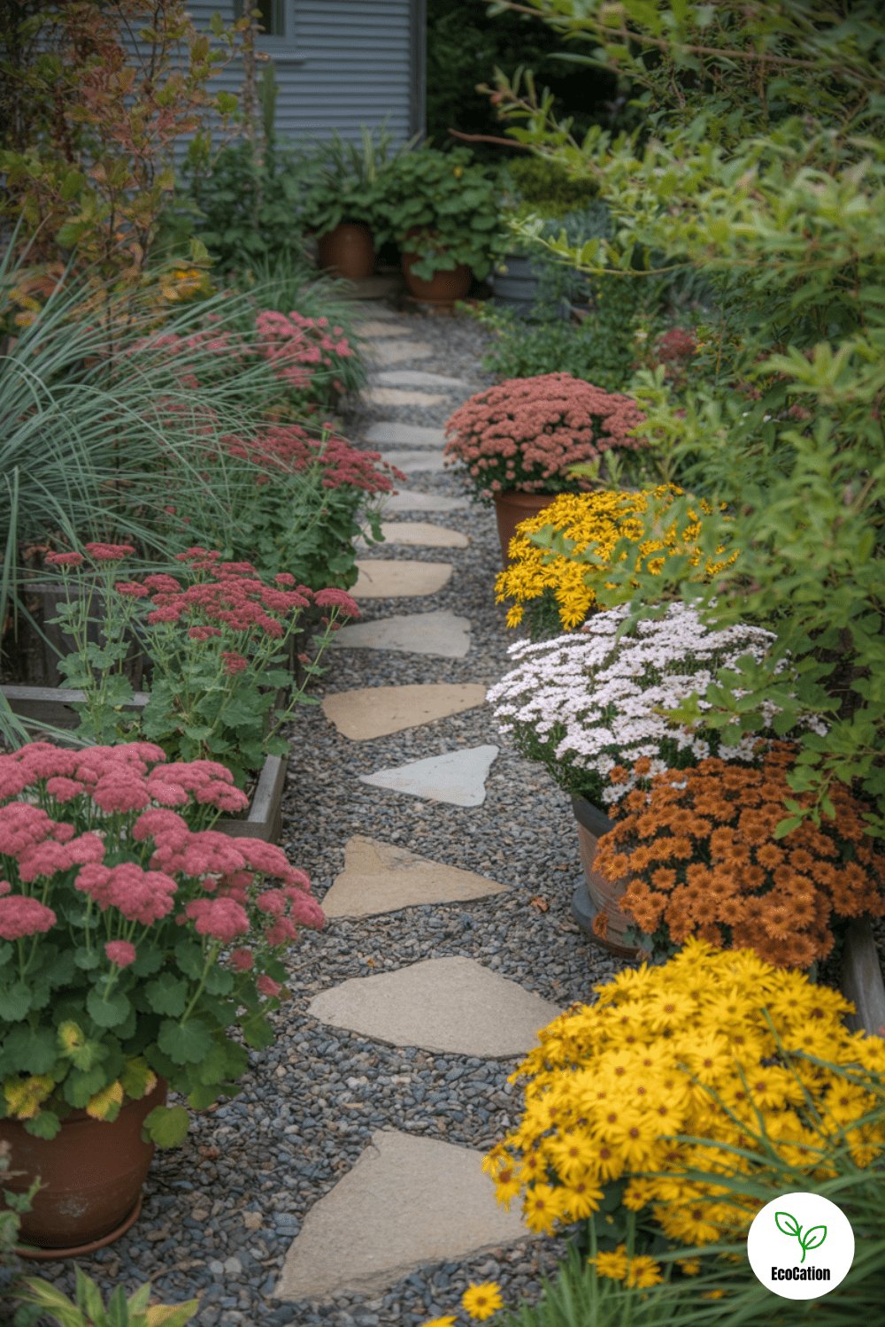 Create a cozy backyard retreat by lining paths with sedum and chrysanthemums. Their low height and rich colors make them ideal for edging. Sprinkle mulch around the base to keep them protected from early frosts.