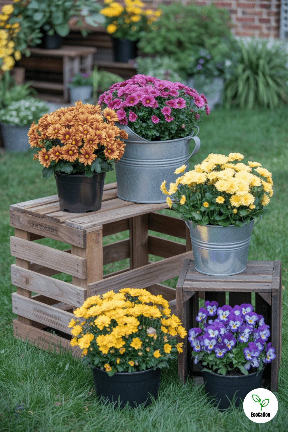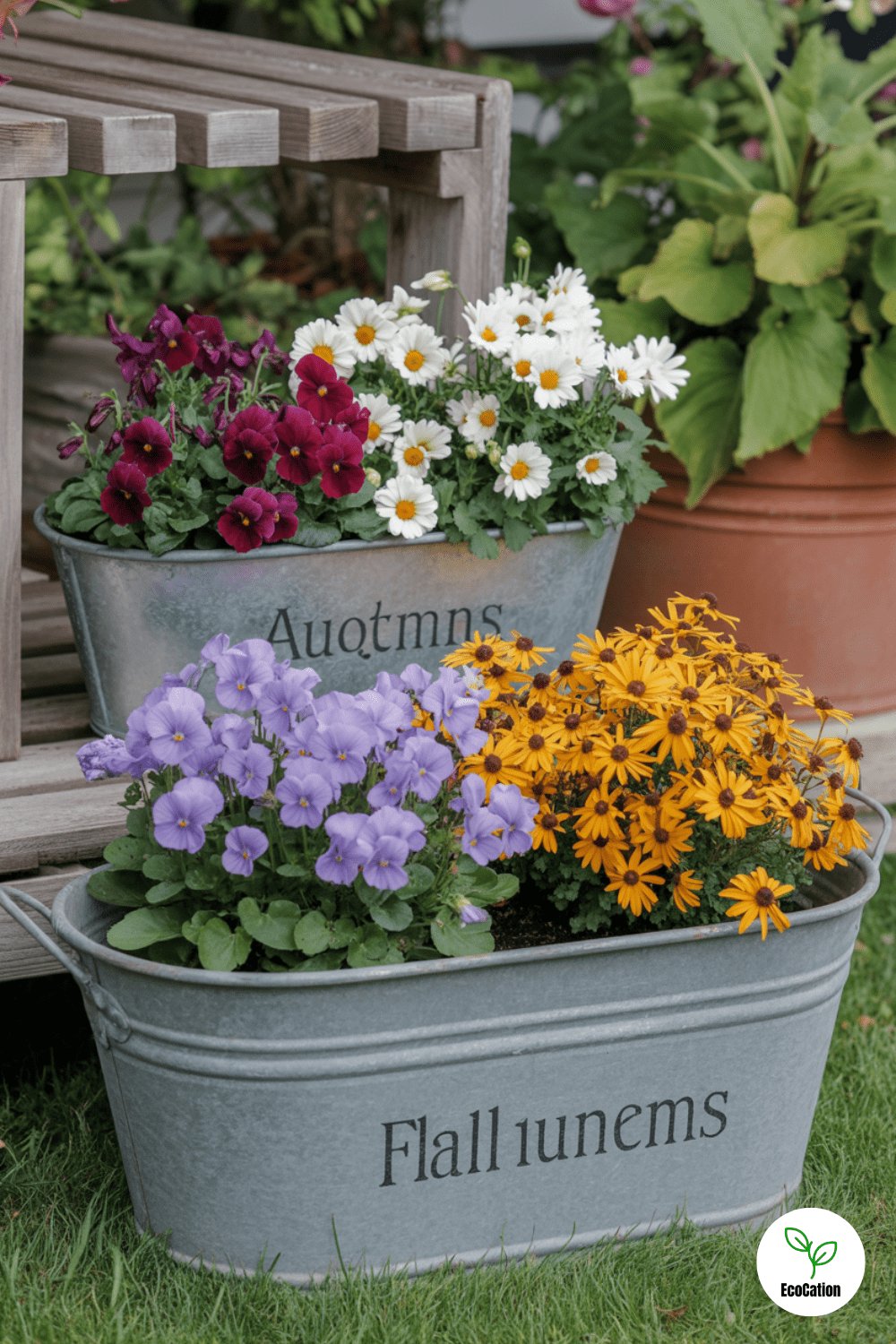 Rustic metal tubs filled with violas and chrysanthemums add vintage charm to autumn gardens. They re easy to repurpose and give off a farmhouse feel. Drill small holes for drainage so the roots stay healthy.