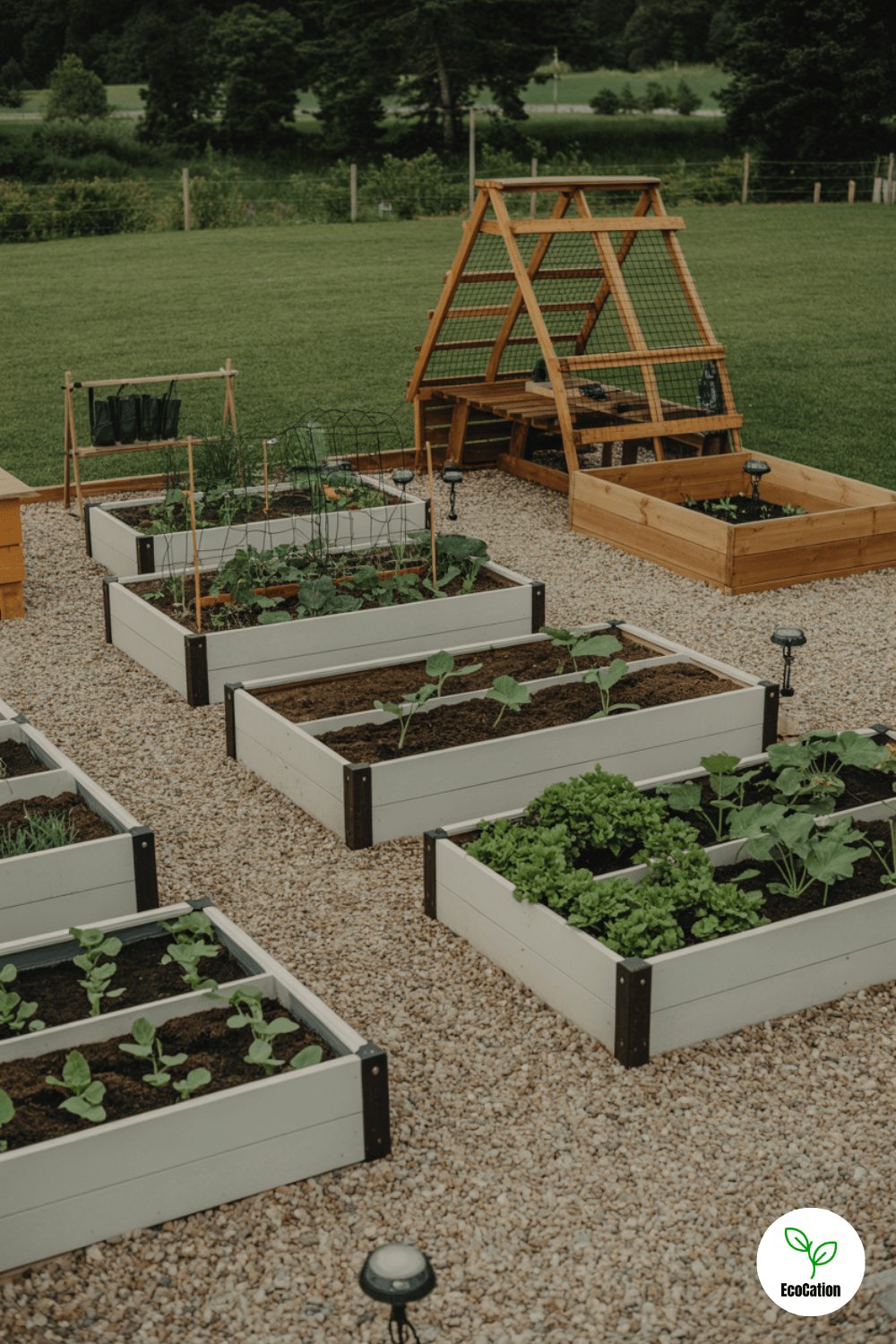 Sleek raised beds filled with rich soil line up cleanly in this modern layout, framed with gravel and dotted with solar lights. It s all about low maintenance with high return. Easy to weed, easy to love especially for neat freaks.
