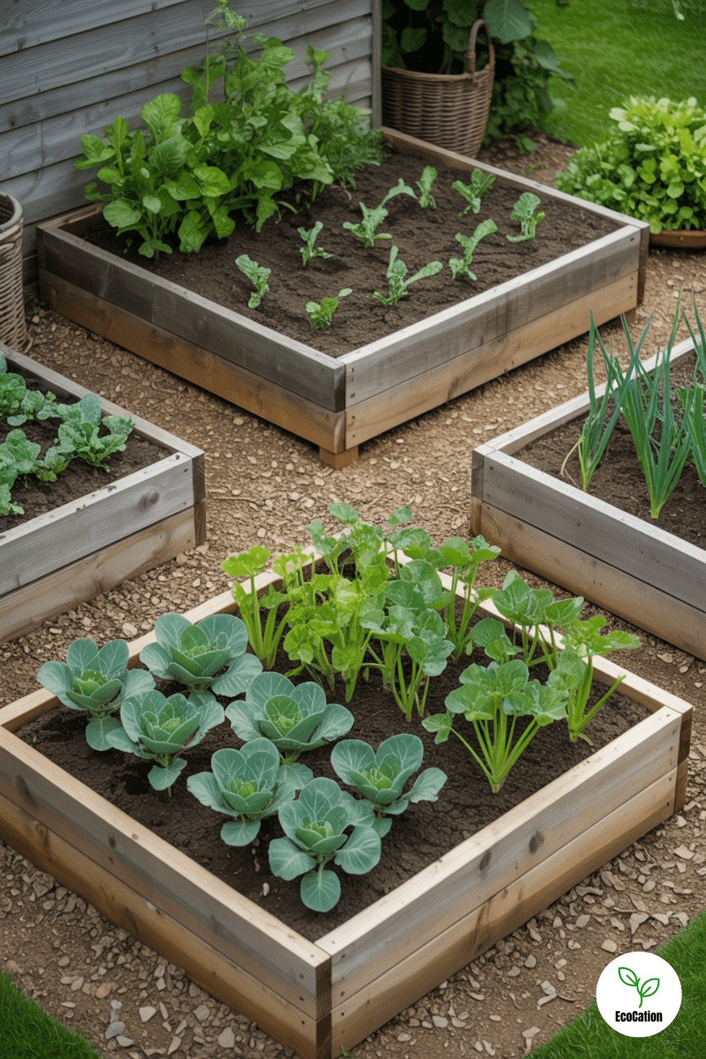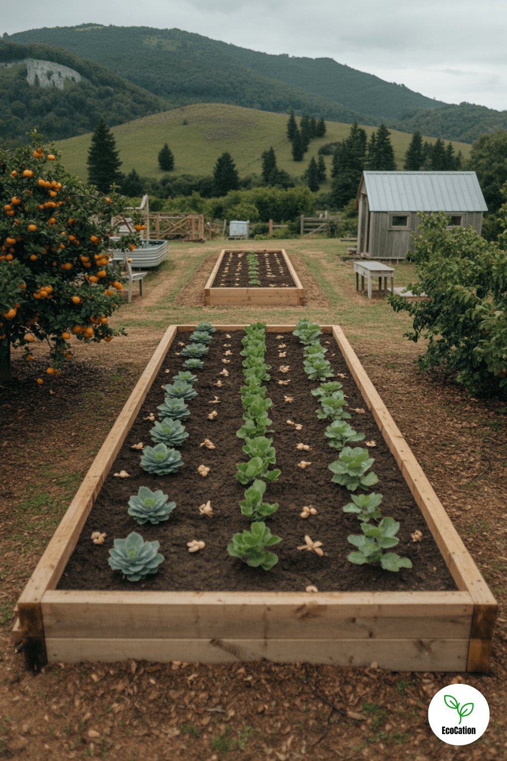 Four raised wooden beds in a clean square arrangement make gardening manageable and fun. This is ideal for anyone just dipping their toes into homesteading. It s easy to water, weed, and plan plus, it looks tidy from every angle.