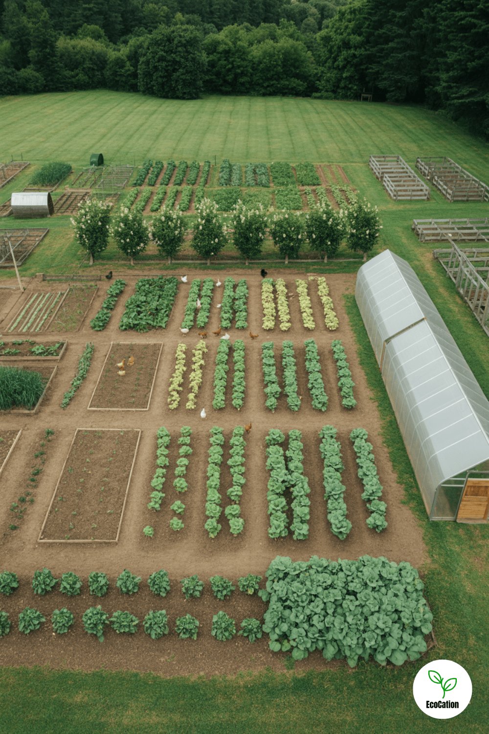 With a central pathway cutting through tidy vegetable rows and berry bushes lining the sides, this 1-acre layout balances structure and abundance. The tucked-away composting corner makes cleanup and reuse a breeze. You ll appreciate how everything flows with minimal effort.