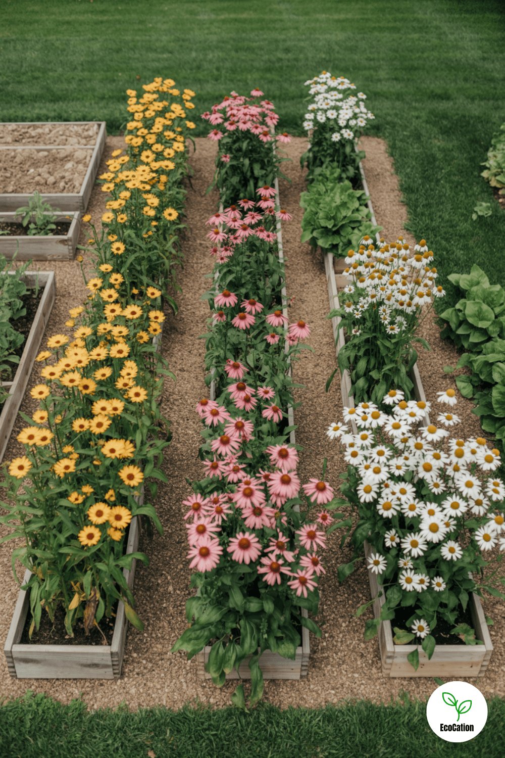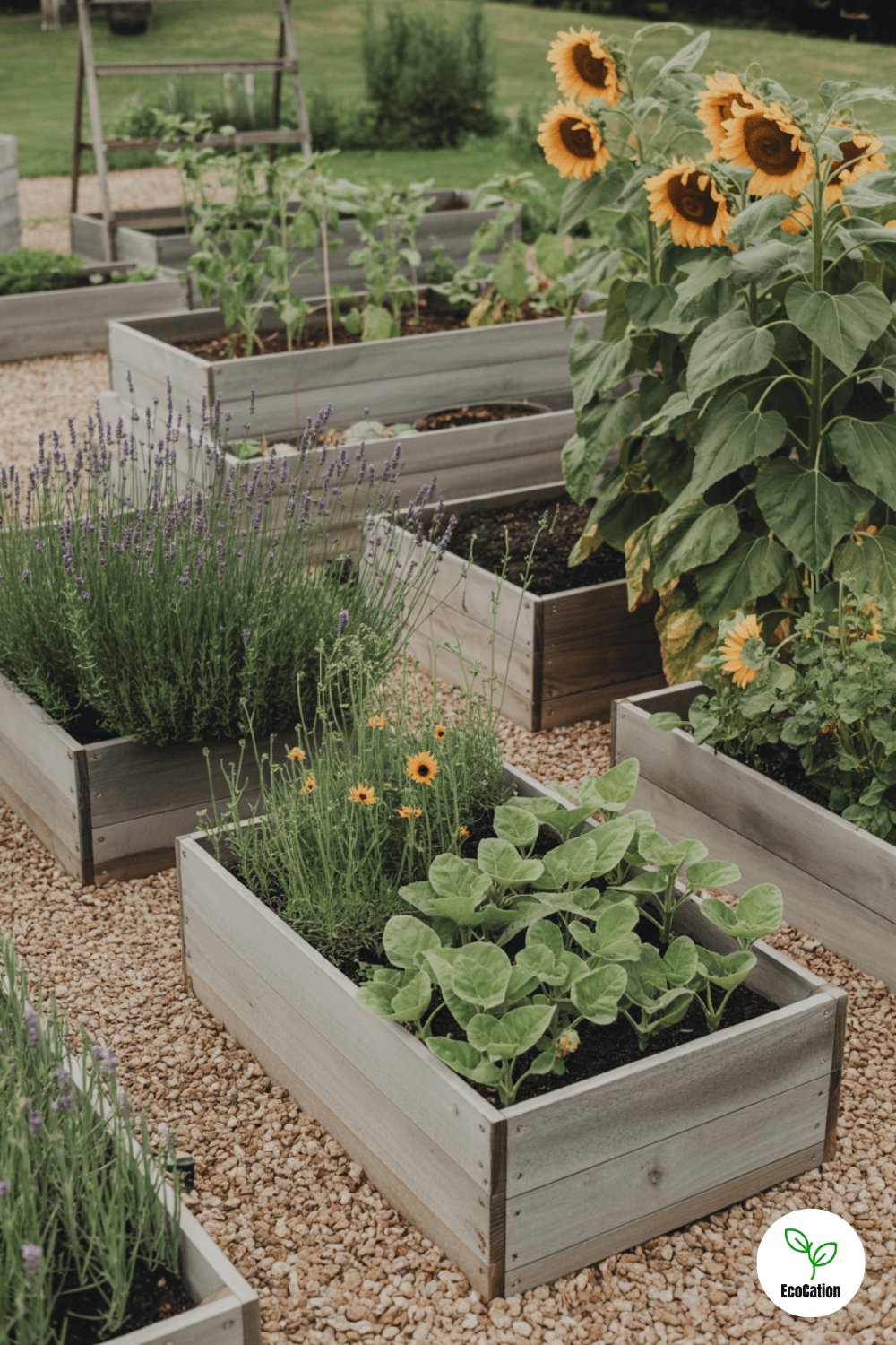 Lavender and sunflowers frame this garden that s laid out for both beginners and bees. With open rows and low-maintenance perennials, it s easy to manage and even easier on the eyes. You ll attract a garden full of life while growing your own.