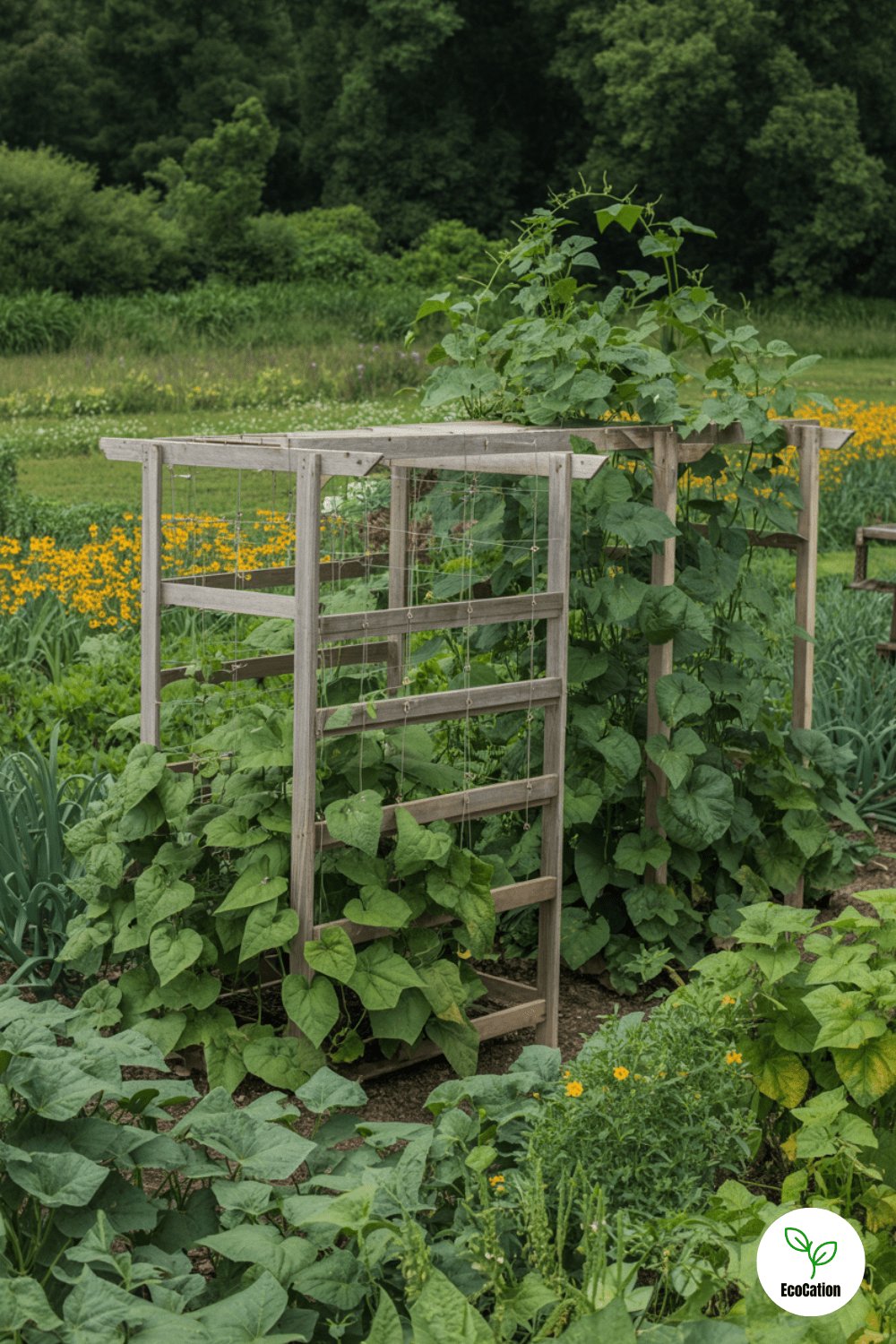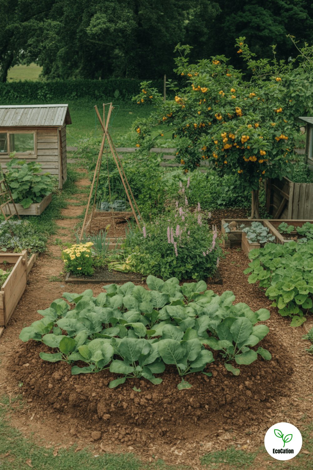 Trellises arch overhead, guiding beans and cucumbers into airy, productive tunnels while wildflowers soften the edges. It s a dreamy setup that works especially well on larger homesteads. Grow up, grow wide, and enjoy the magic of walking through your own food forest.