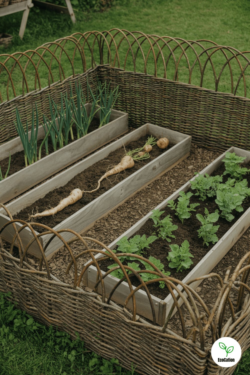 Woven willow fencing surrounds a charming potager-style layout filled with root vegetables and healing herbs. This setup is ideal for those who love to cook or craft natural remedies. It s equal parts beauty and bounty, and it feels like a step back in time.