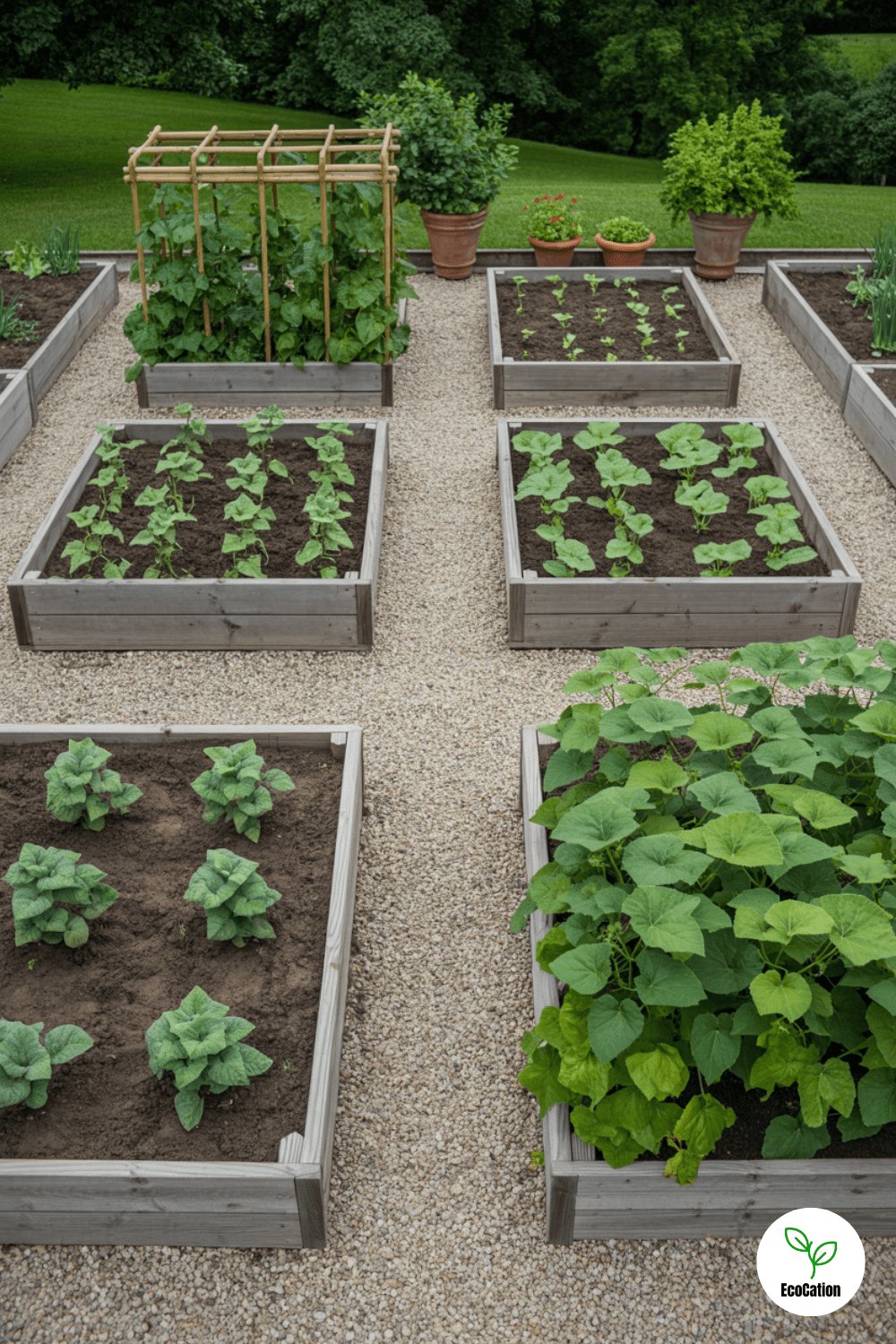 Neat gravel paths divide this layout into easy-to-manage squares with trellised cucumbers climbing centerstage. Potted herbs dot the borders, making the whole space feel tidy and inviting. If you love order, this setup is for you.