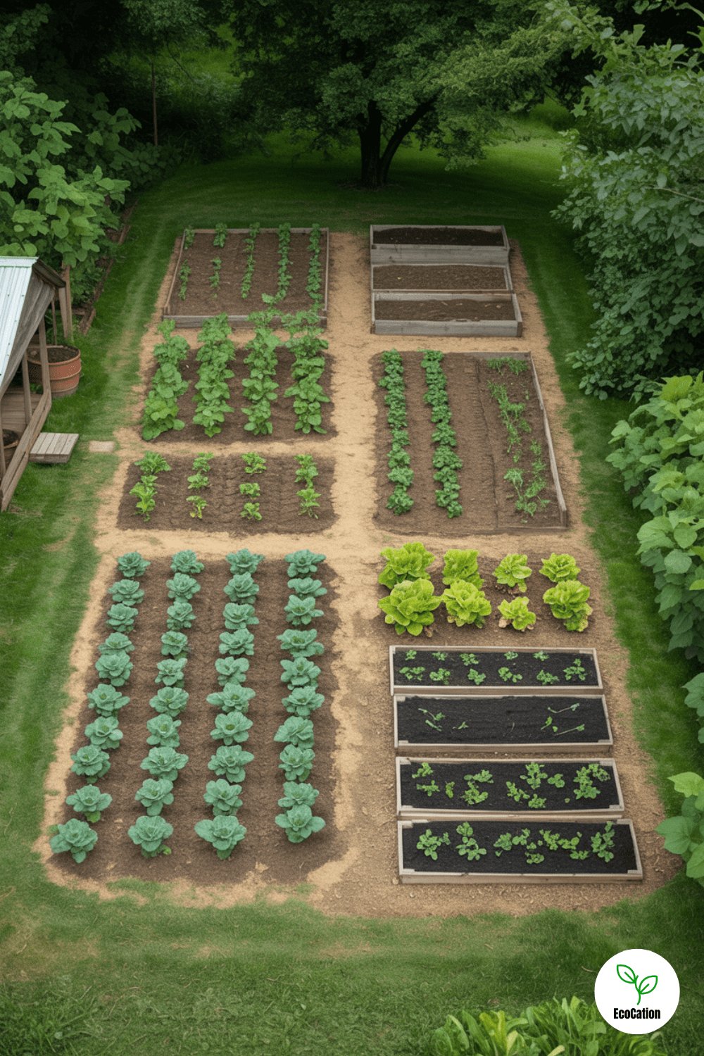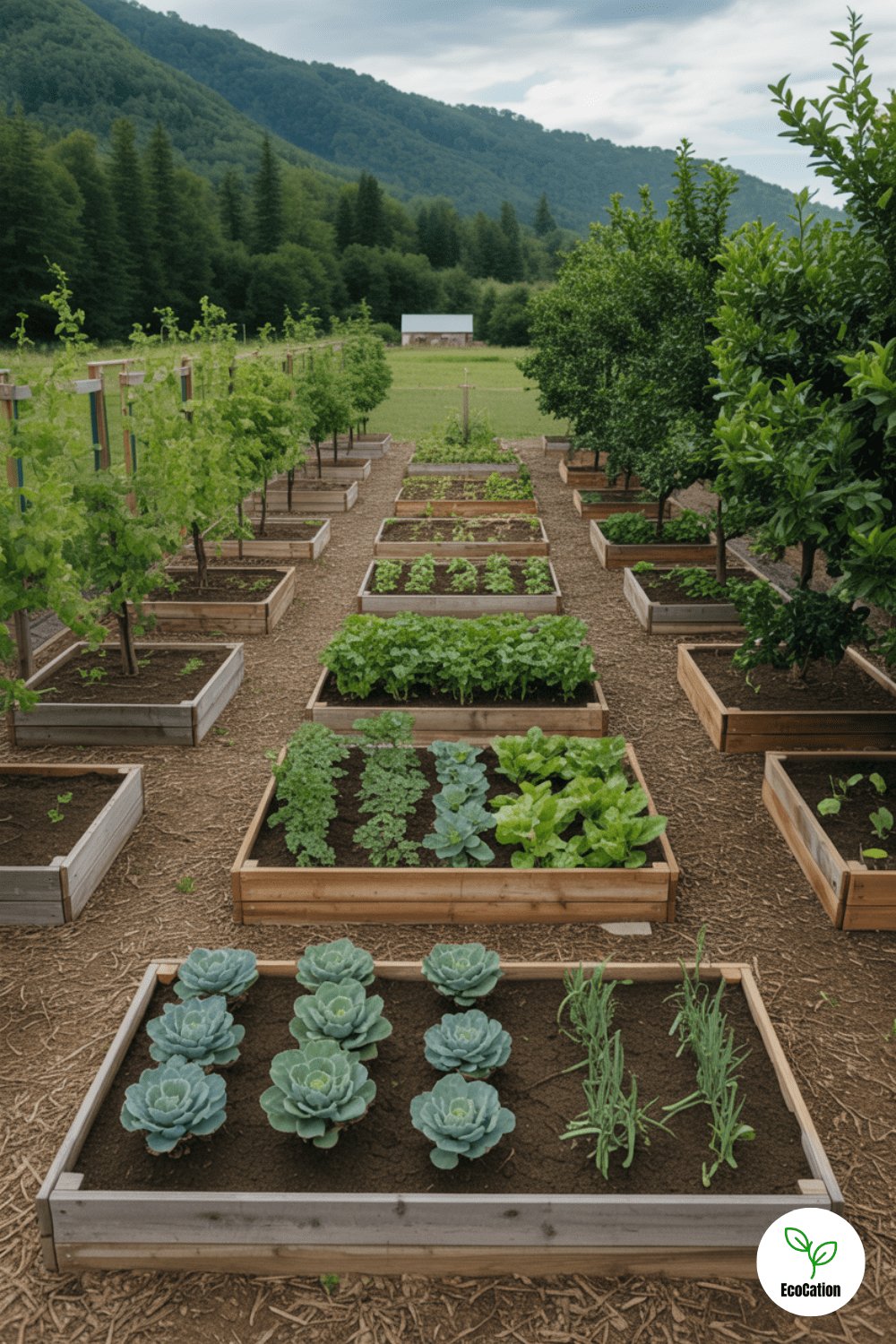 Dwarf fruit trees wrap around this garden layout, creating a living fence that s both beautiful and fruitful. Inside, vegetables mingle with herbs in companion-friendly clusters. It s a great layout for those looking to grow a bit of everything on 2 acres without sacrificing style.