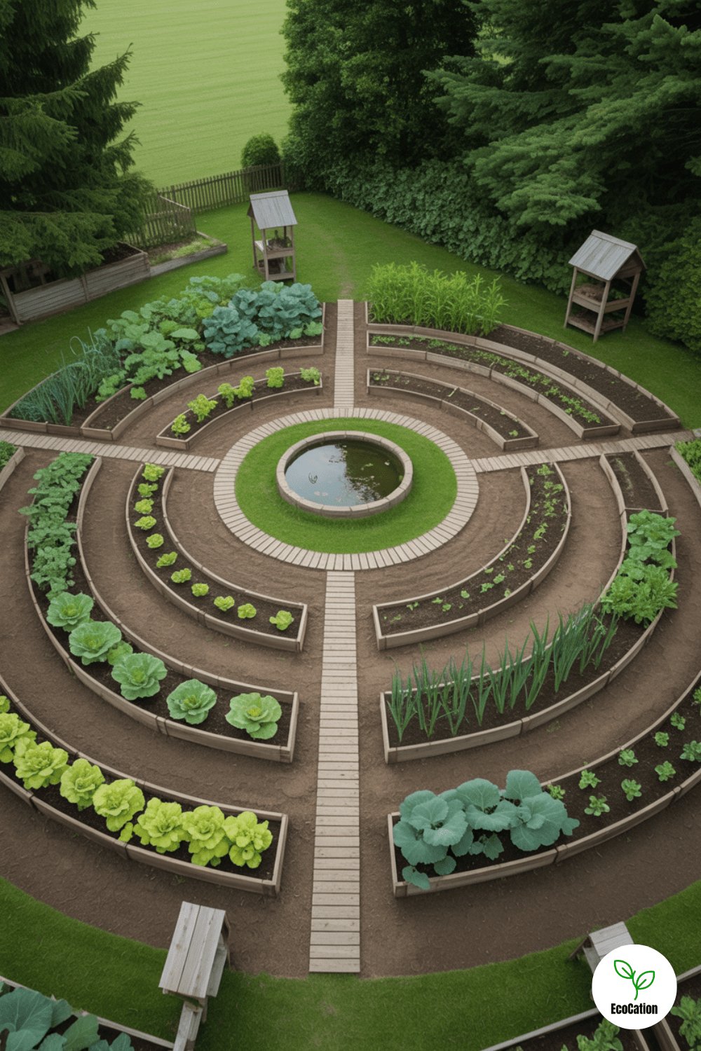 A small pond anchors this whimsical round layout, with spiral beds curving outward like a living mandala. Birdhouses and flowers turn it into a wildlife haven, while veggies grow in every direction. It s functional, peaceful, and truly one-of-a-kind.