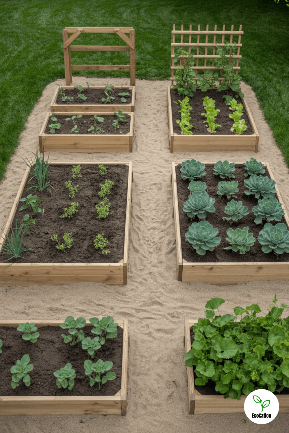 This creative setup invites the whole family in with fairy garden details, sandbox paths, and kid-height veggie beds. It s a beginner layout with soul designed to teach, entertain, and feed in equal measure. A perfect way to plant memories.