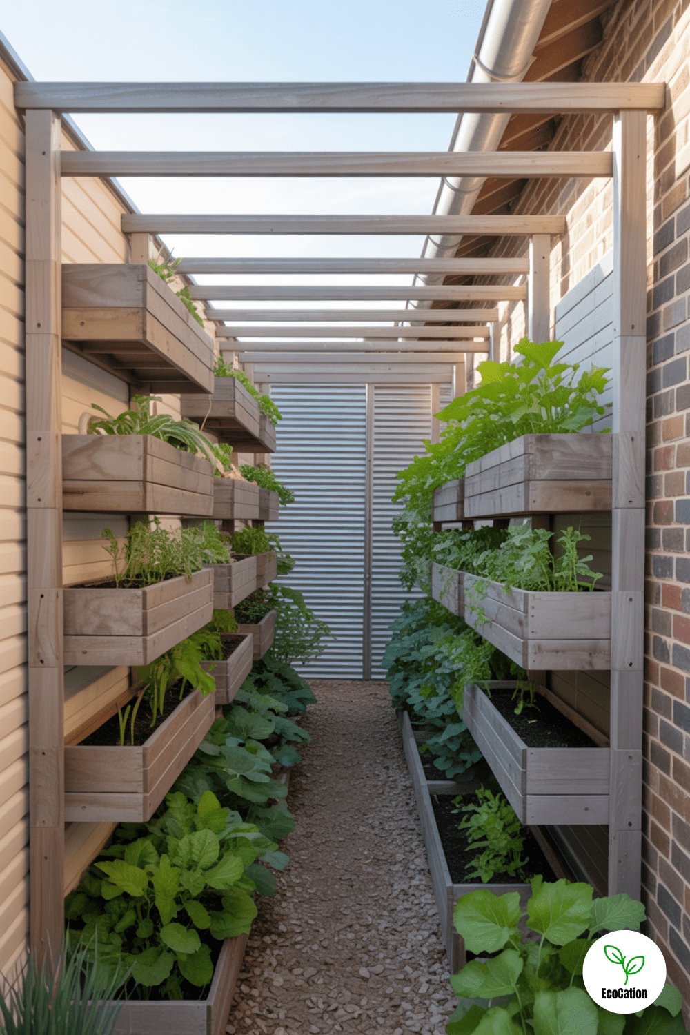 Got a narrow plot? Go up, not out. Vertical planters line a sunny wall in this compact layout, making use of every inch. It s perfect for herbs, strawberries, or leafy greens and you ll be surprised just how much food you can grow in a tight space.