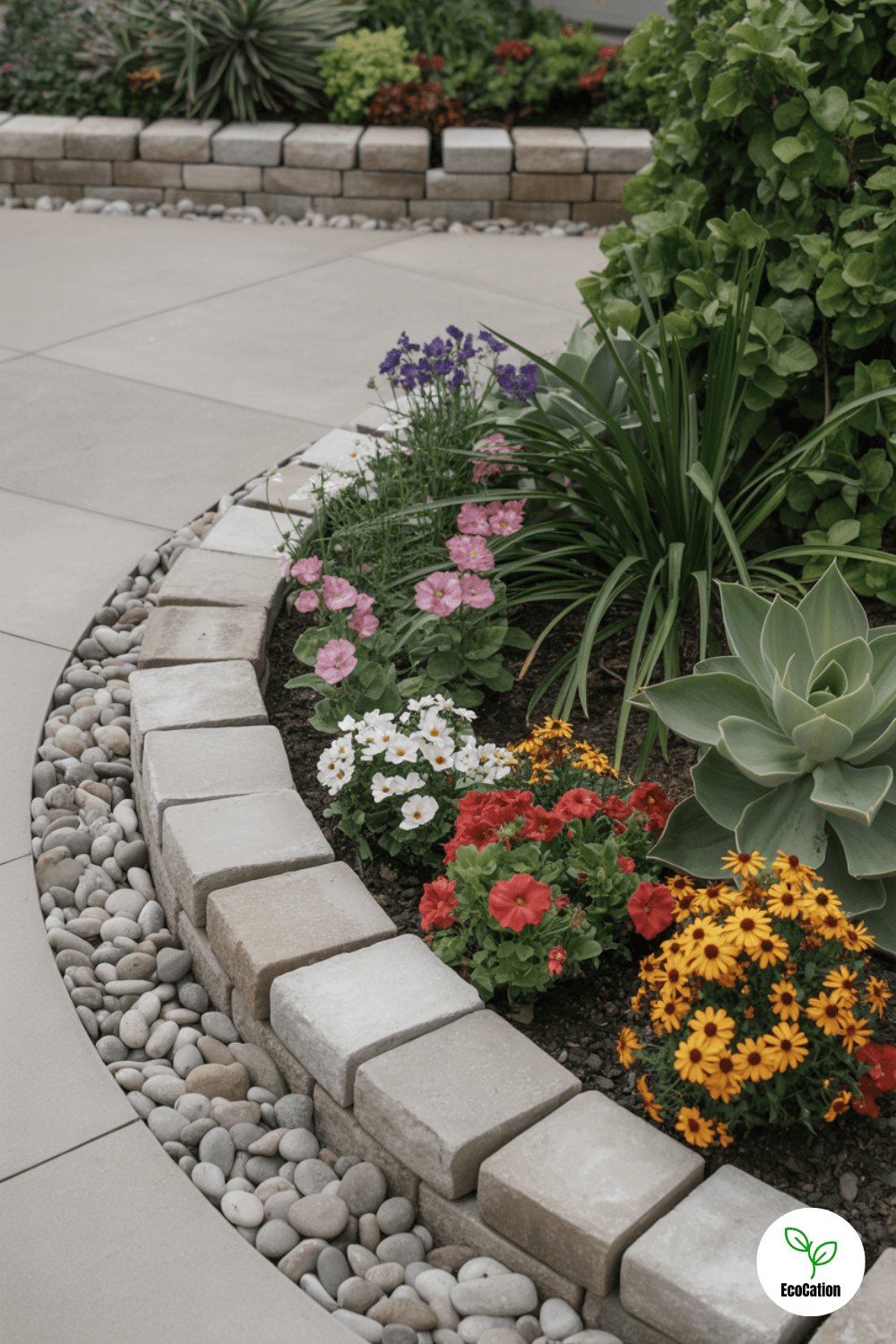 A curving line of smooth stone edging brings elegance to your flower bed, especially when paired with river rocks for a soft contrast. The curves guide your eye naturally, while the stones help with drainage and weed control. Try choosing stones in tones that complement your flowers for extra cohesion.