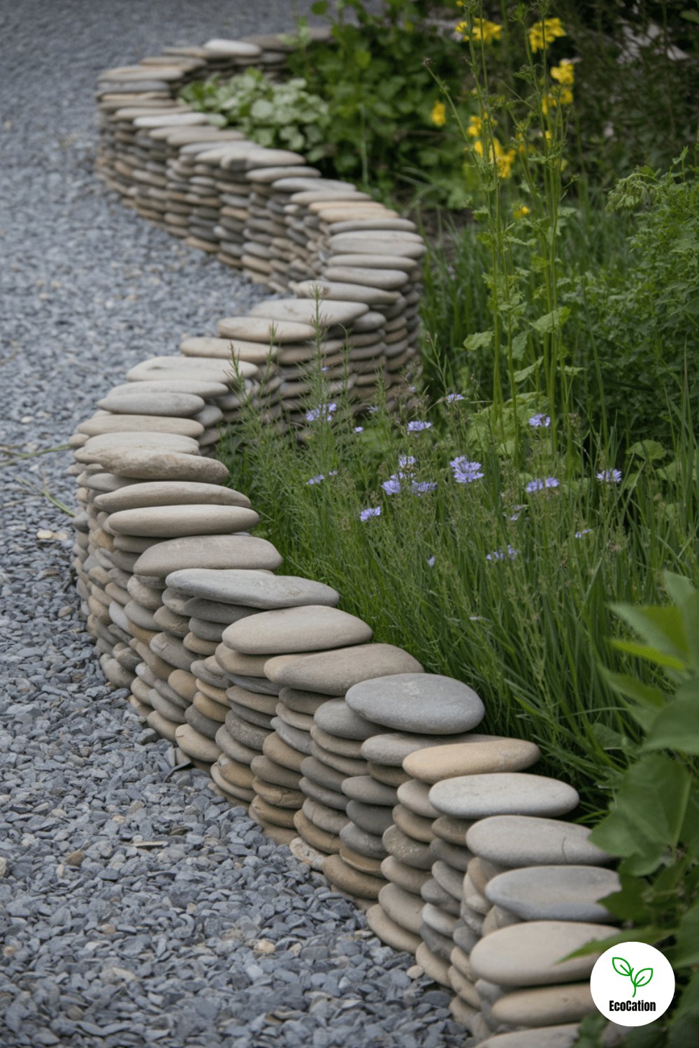 Flat river stones stacked two layers high offer a soft, natural edge for wildflower beds. The curved shapes blend beautifully with organic planting styles. Try using stones of similar size to keep the edge looking consistent.