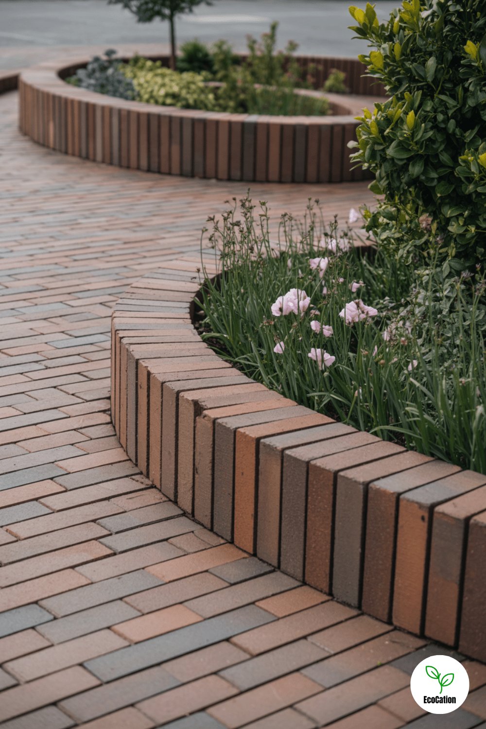 Old red bricks arranged in a scalloped pattern create an inviting, cottage-garden feel. Their weathered look adds instant character, and the rounded tops are perfect for keeping mulch or soil neatly in place. Slight spacing between bricks allows for natural drainage too.
