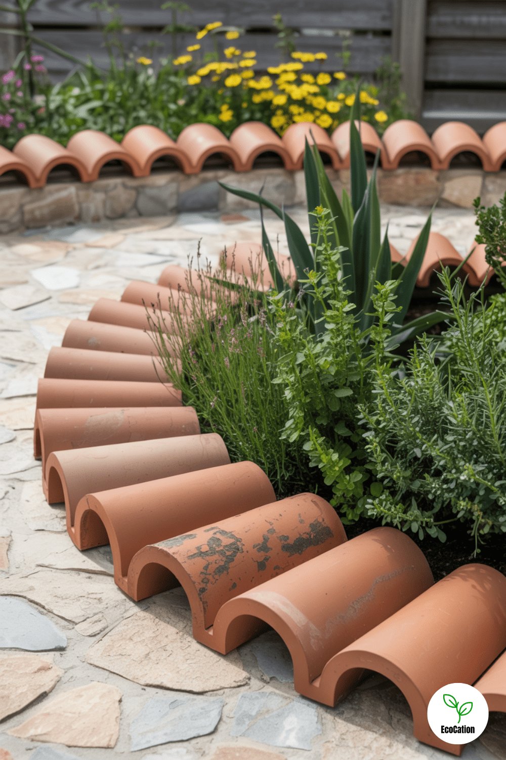 Old terracotta roof tiles, half-buried in a scalloped line, give off serious Mediterranean vibes. Their warm hue complements herbs like thyme, basil, and rosemary. Press them into the soil just enough to keep them upright and stable.