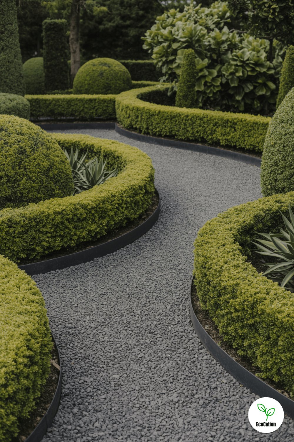 Slim black metal edging defines gravel paths with a sleek, contemporary touch. It holds its shape well and pairs nicely with manicured hedges or modern sculptures. Install with hidden spikes for a clean, floating look.