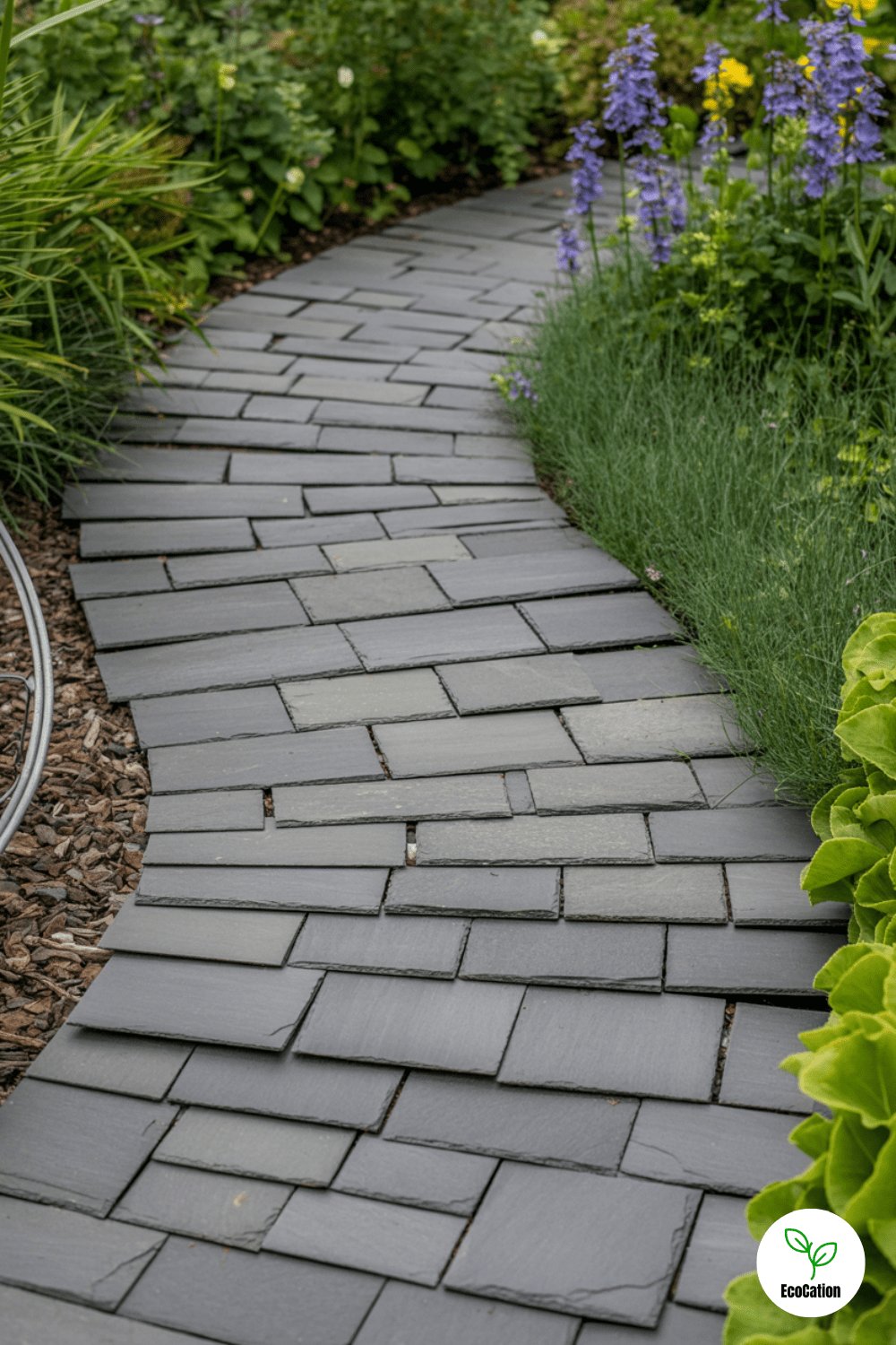 Old slate roof shingles arranged in a wavy line bring texture and rhythm to perennial beds. Their subtle tones blend easily with almost any planting scheme. Use a mix of heights for movement and visual interest.