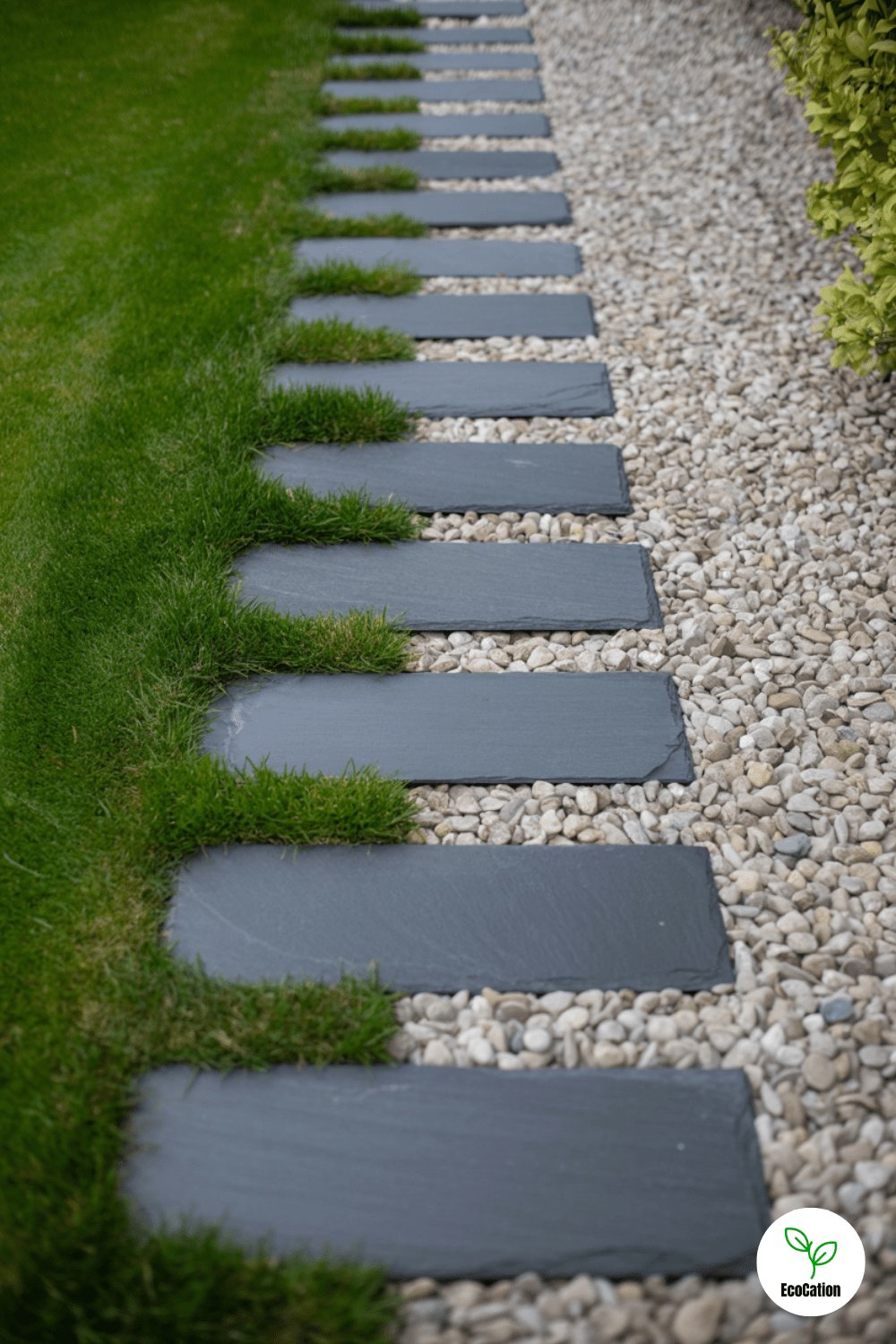 Long pieces of slate lying flush with the lawn are an elegant way to define gravel or stone paths. Their slim, linear design makes maintenance a breeze you can mow right over the edge. Choose darker slate to contrast with light gravel for a refined touch.