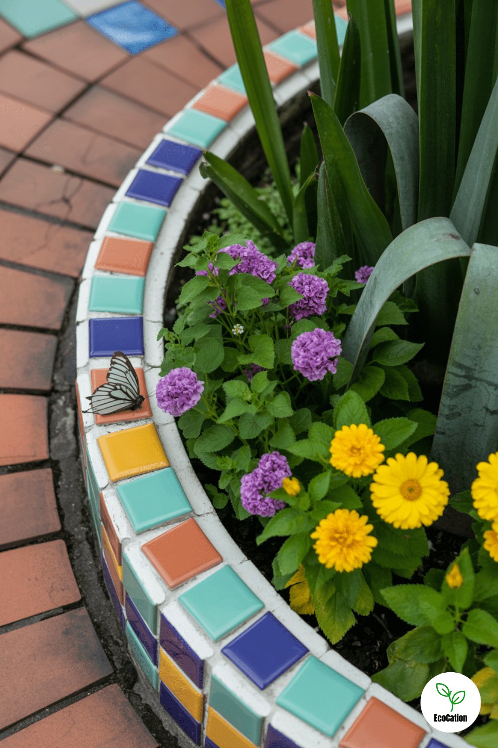 Broken ceramic tiles create colorful mosaic edging ideal for butterfly or sensory gardens. Arrange them in swirling patterns or simple rows depending on your style. Use outdoor grout and sealant to protect your design from the elements.