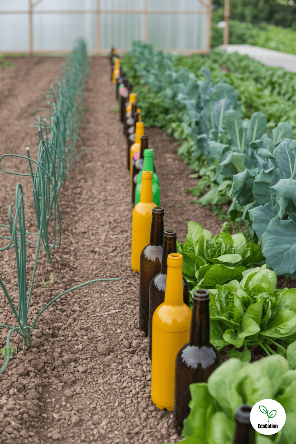 Upside-down glass bottles form a quirky, artistic edge perfect for veggie plots. Mix different colors for a stained-glass effect or stick to one hue for cohesion. Bury them deep enough to stay stable and safe.