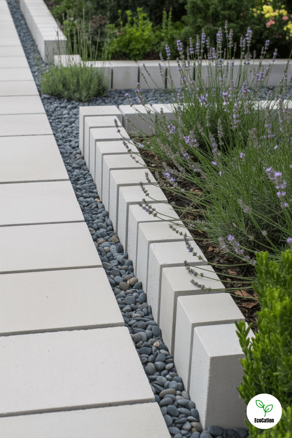 Square concrete blocks give a crisp, architectural feel to any garden. This type of edging works wonders alongside a clean pathway or modern planting scheme. Add lavender and white pebbles for softness and scent, balancing out the bold structure with natural beauty.
