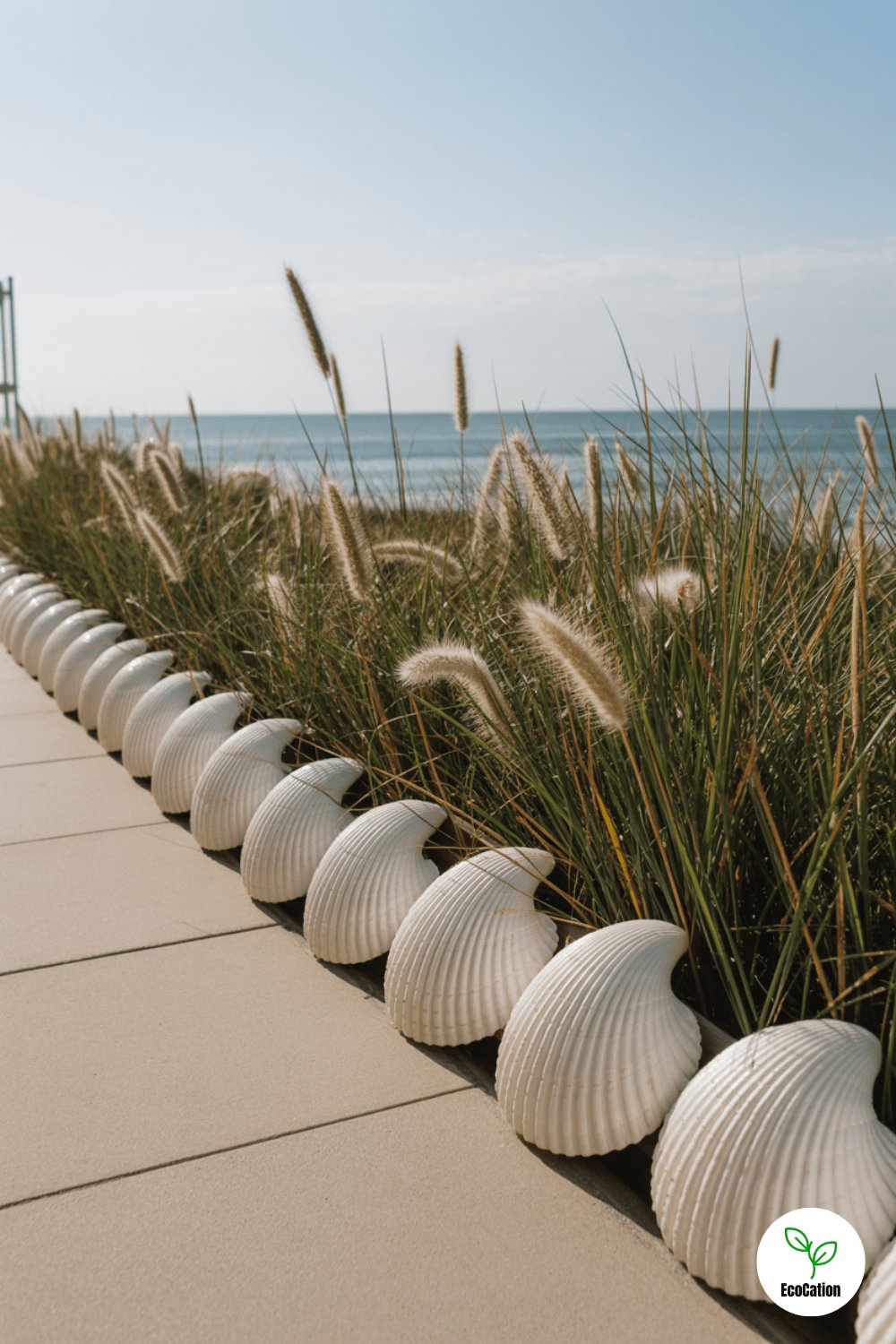 White seashells make a whimsical edging for coastal-style gardens. Their curved shapes reflect sunlight and look stunning beside grasses or succulents. Rinse and dry your shells before placing them to keep things tidy and pest-free.