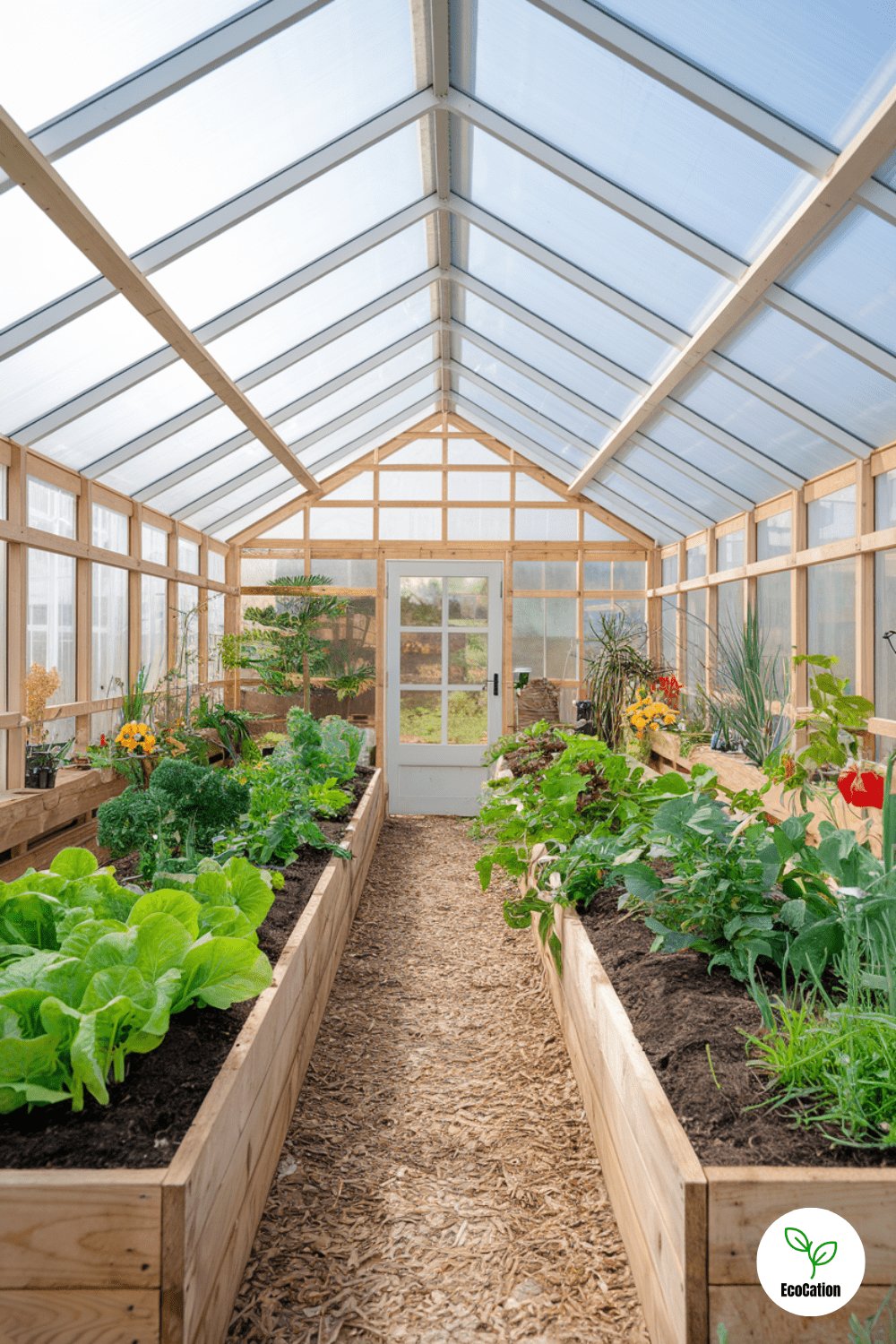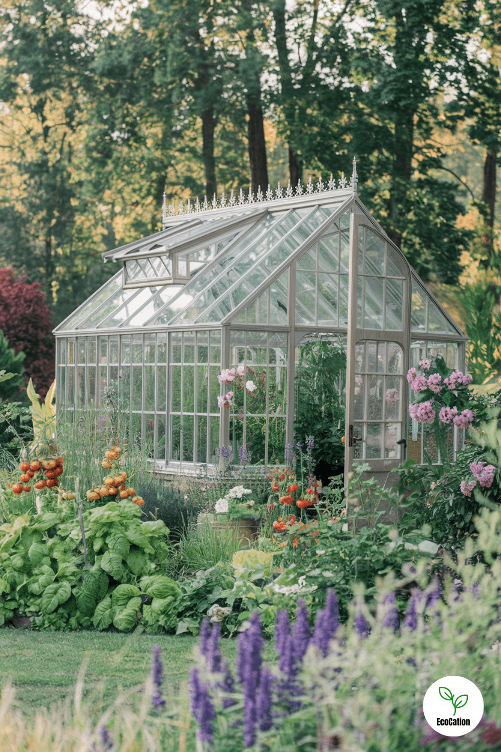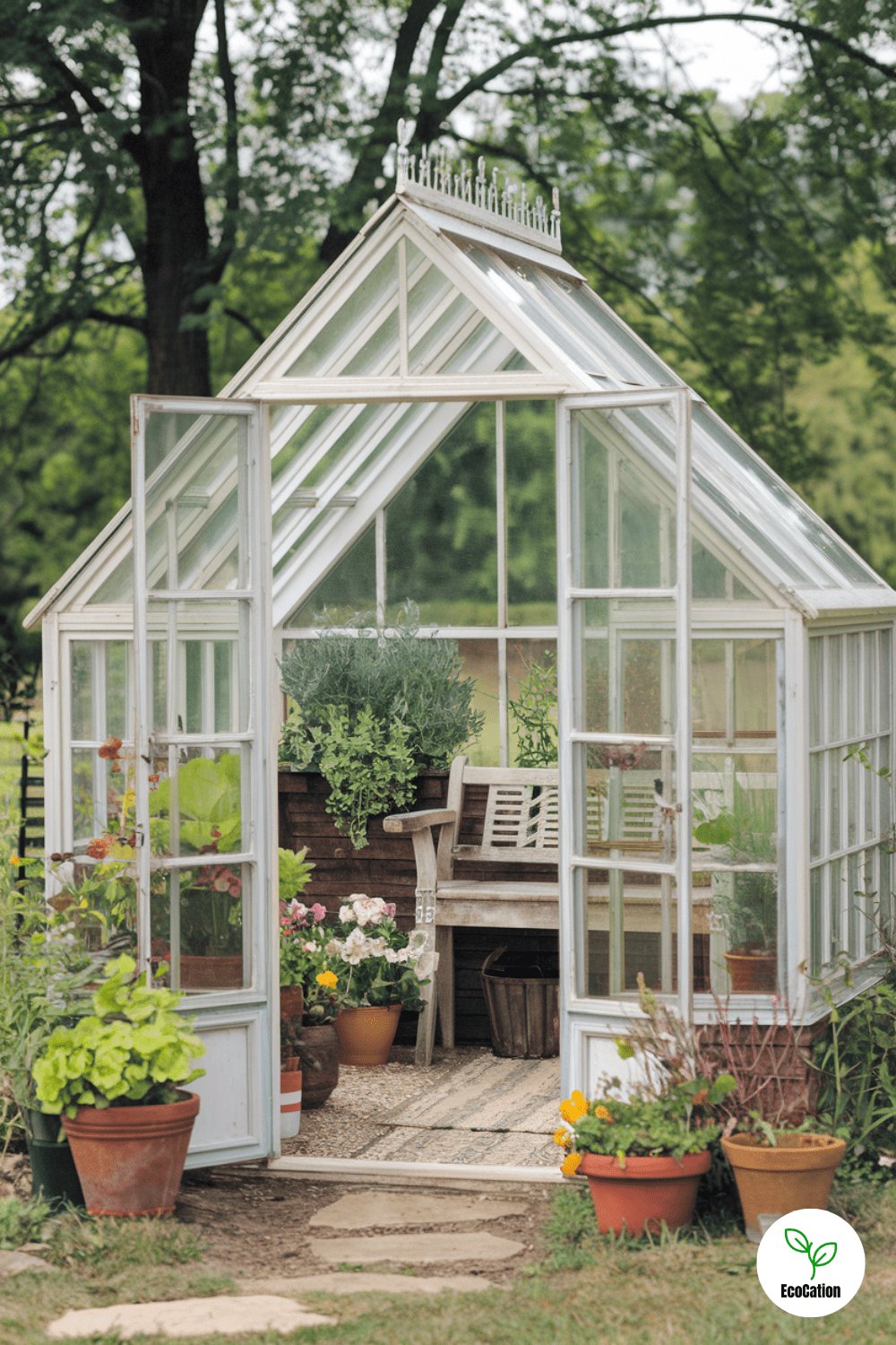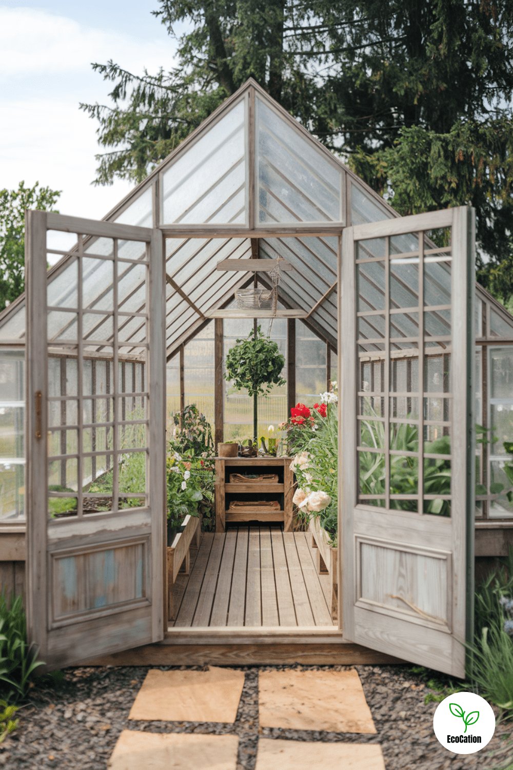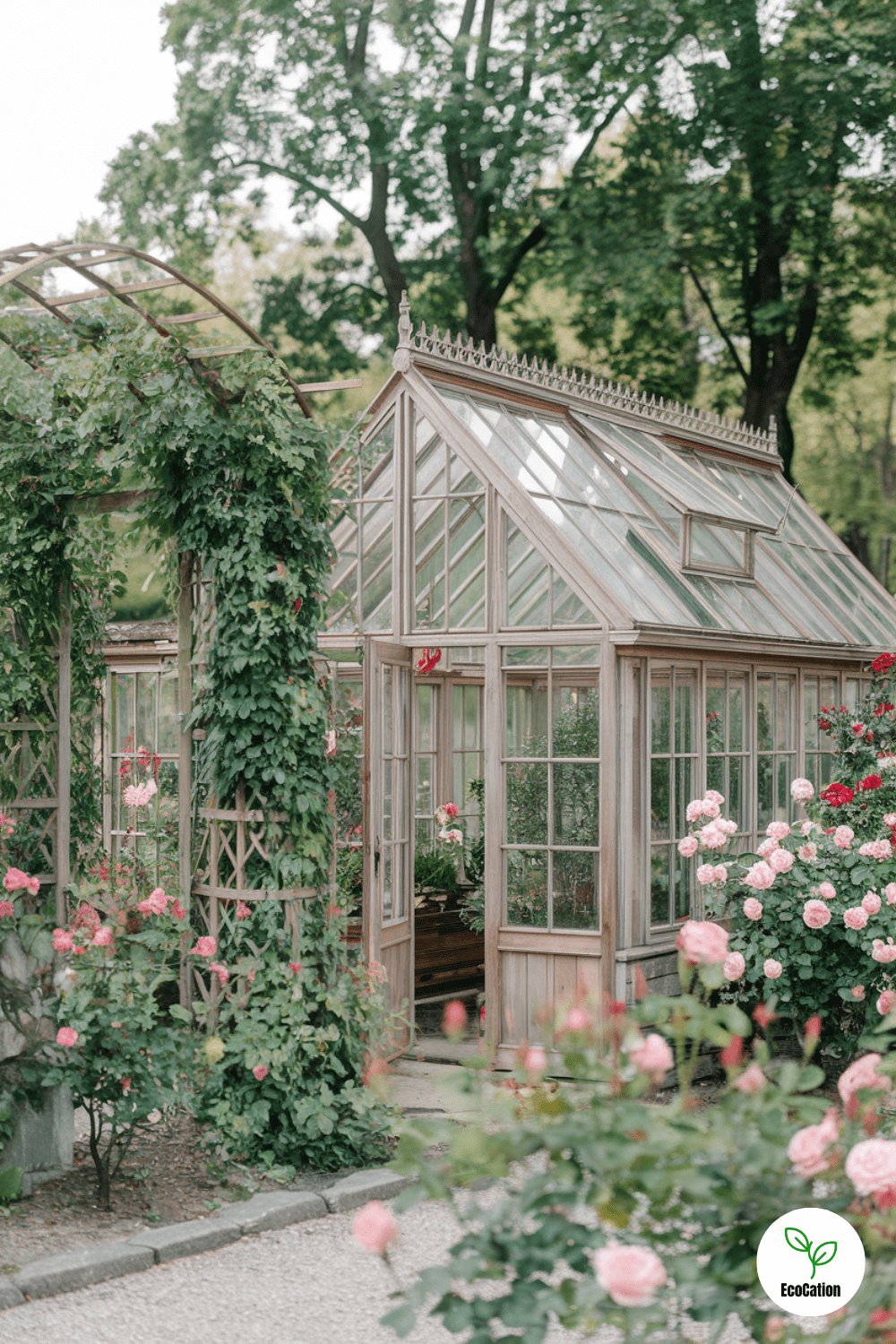 For a nostalgic vibe, a wooden-framed greenhouse with antique-style windows is ideal. Surrounded by ivy-covered trellises and blooming rose bushes, this greenhouse will be both a functional garden space and a beautiful focal point. Practical tip: Add a rainwater collection system to keep your garden watered in a sustainable way.