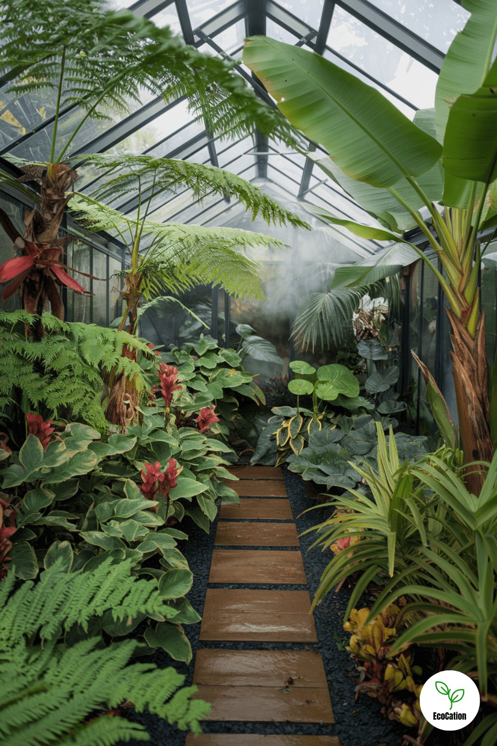 A tropical greenhouse oasis filled with ferns, banana plants, and misty air creates a mini rainforest in your backyard. This type of greenhouse offers a lush, vibrant escape from the ordinary. Practical tip: Install a misting system to maintain humidity levels, and place your tropical plants in shaded areas to avoid direct sunlight.