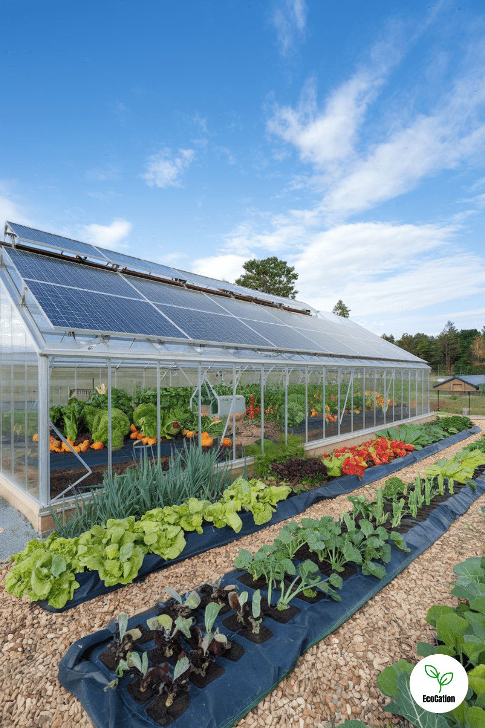 A modern greenhouse with solar panels on its roof offers a sustainable way to grow vegetables year-round. Harnessing solar energy will help reduce energy bills and provide a cleaner, more eco-friendly way to power your greenhouse. Practical tip: Place your solar panels at a tilt for maximum sun exposure, especially in the winter months.
