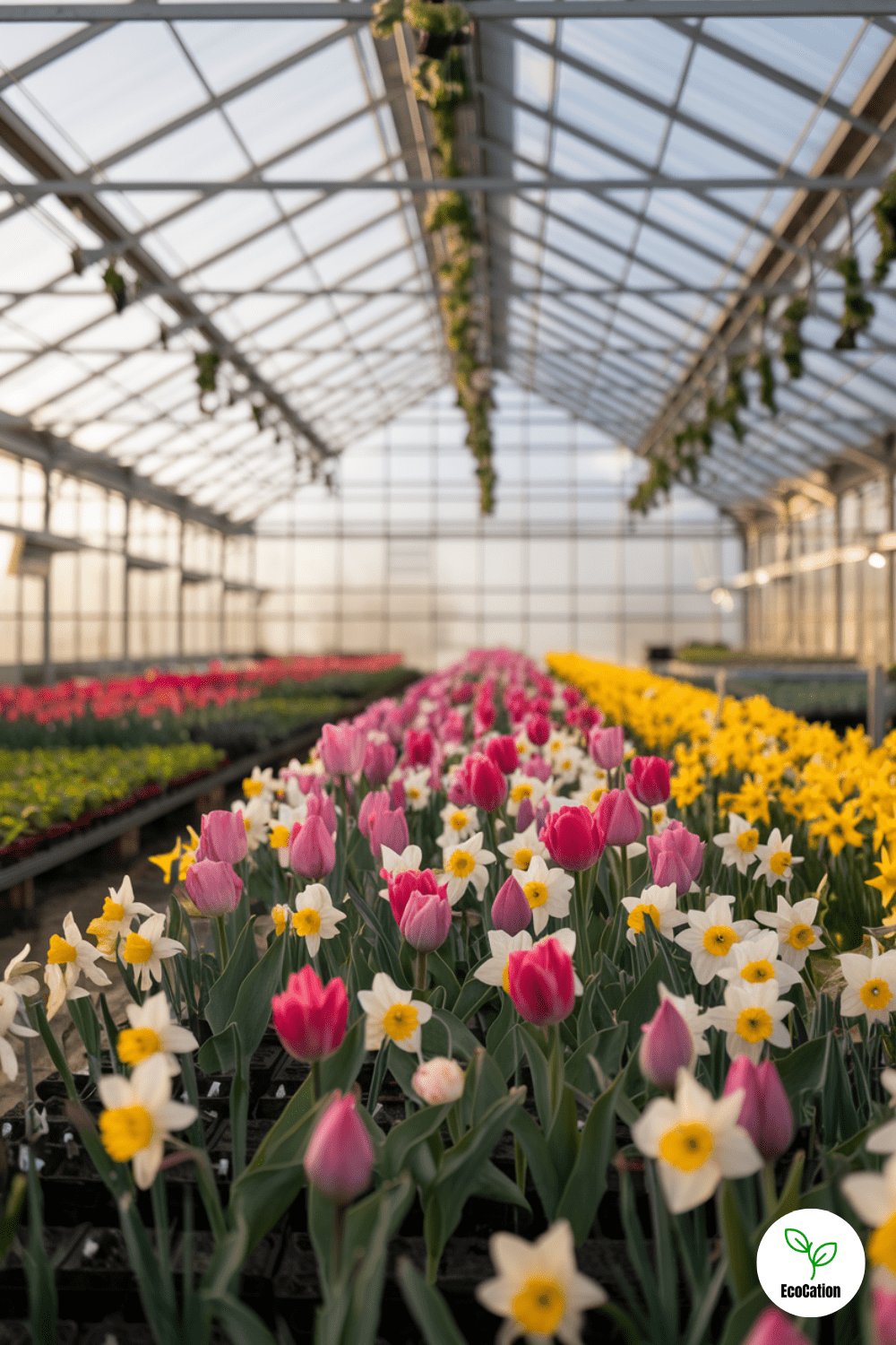 A spring greenhouse filled with vibrant tulips, daffodils, and seedlings ready for planting is the perfect way to greet the season. Golden morning sunlight will bathe your plants, promoting growth and a healthy environment. Practical tip: Incorporate a rotating fan to increase airflow and keep temperatures stable for your plants.