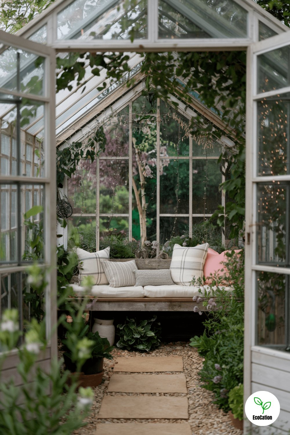 A rustic greenhouse doubles as a peaceful retreat. With a wooden bench, soft cushions, and twinkling fairy lights, this space provides a perfect escape while you tend to your plants. Practical tip: Keep a few plant-friendly candles in the space for ambiance and to help keep pests at bay.