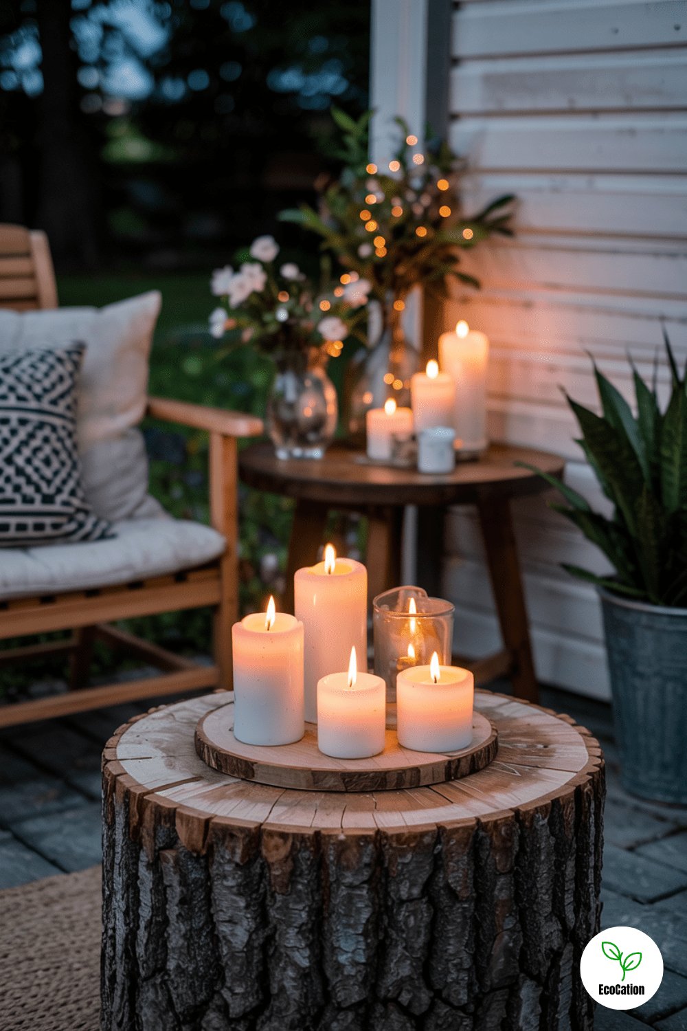 Create magical evening ambiance by grouping pillar candles of varying heights on a flat stump. Use hurricane globes to protect flames from breezes, and choose citronella candles to repel insects. For safety, keep the arrangement away from overhanging branches and always extinguish before leaving unattended. This simple centerpiece makes ordinary summer nights feel special.
