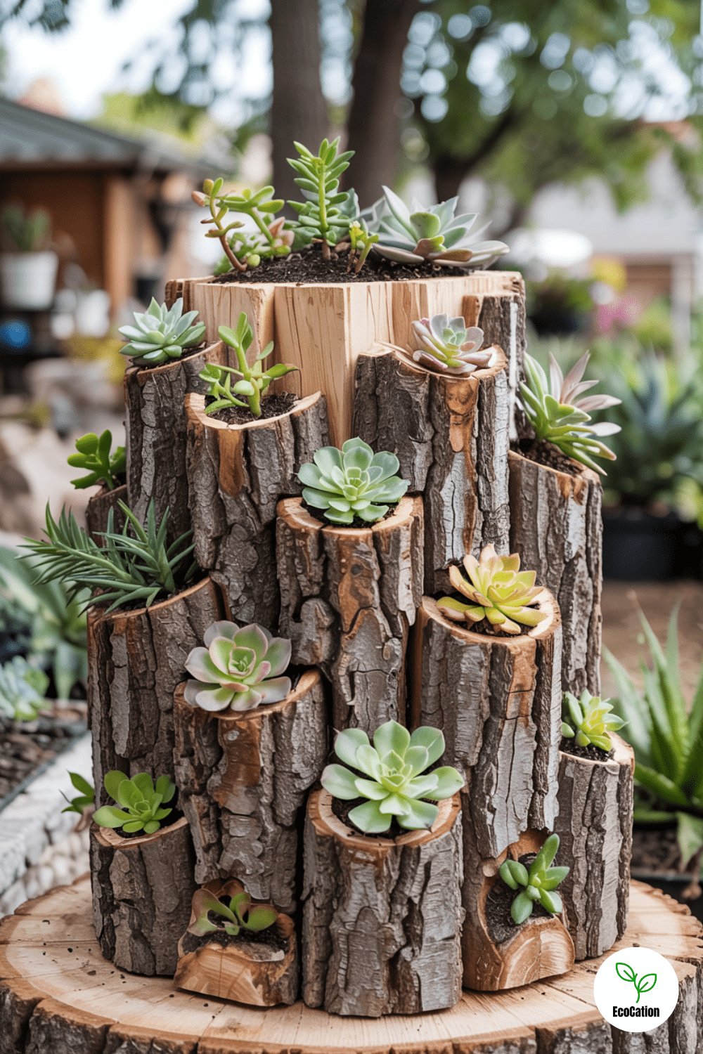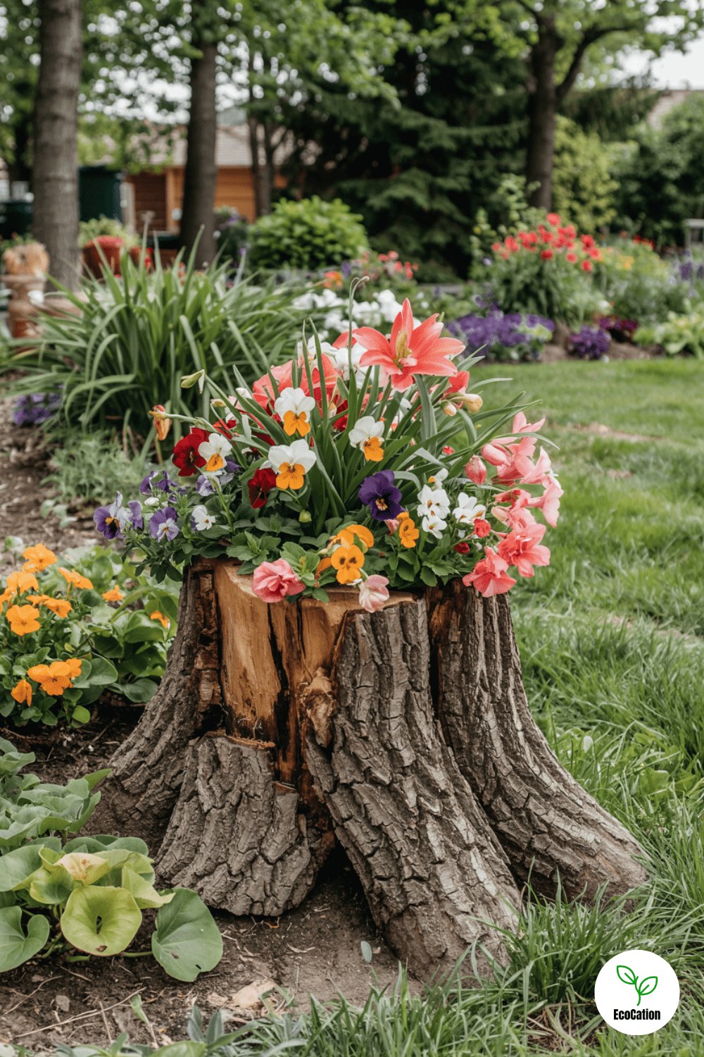 Give vertical interest to your garden by carving planting pockets into the sides of a standing stump. Fill them with drought-resistant succulents like hens-and-chicks or sedum that thrive in shallow soil. The decaying wood provides perfect drainage for these low-maintenance plants. Rotate the stump occasionally so all sides get equal sunlight for even growth.
