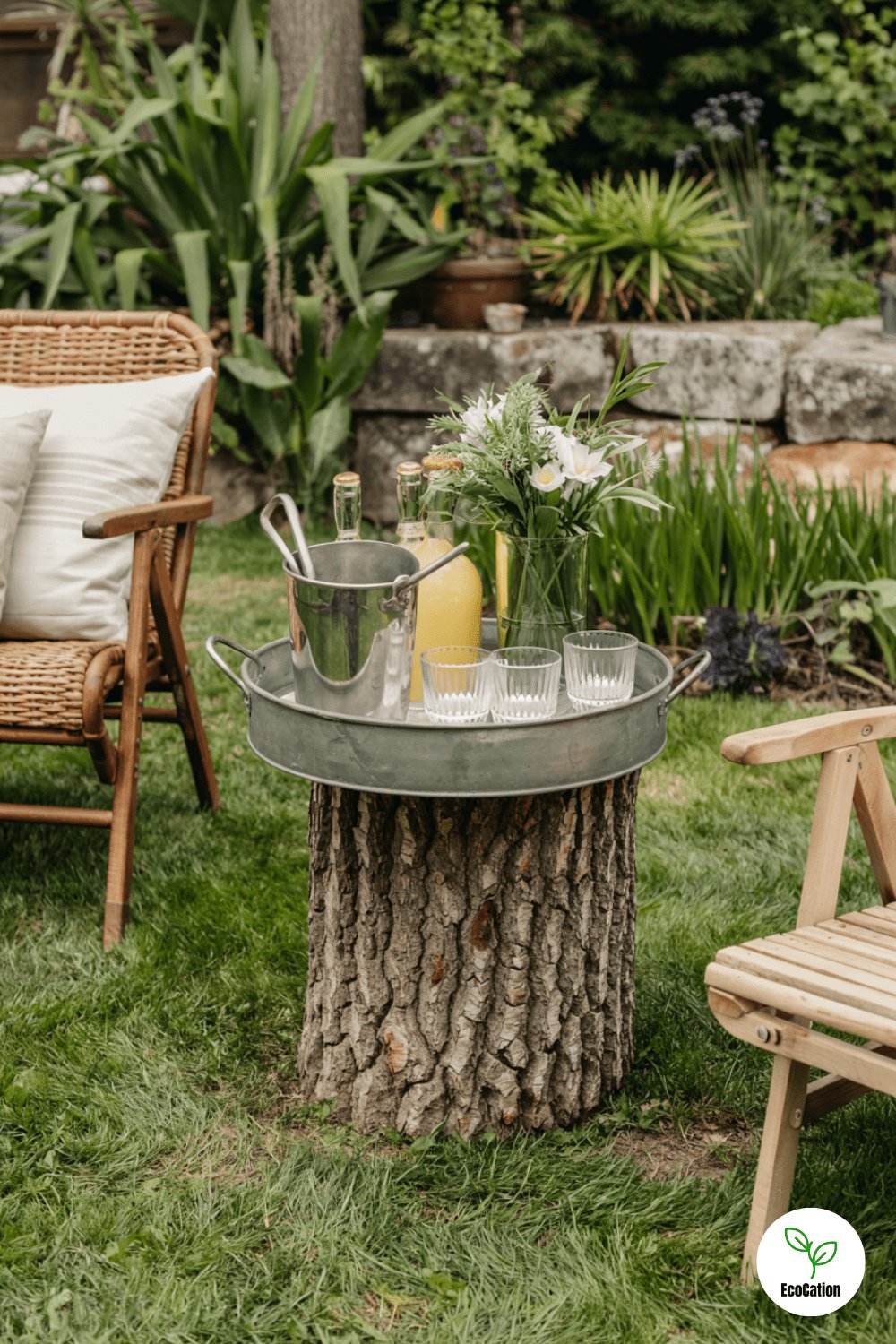 Hosting a backyard party? Turn a wide stump into a natural drink station. Top it with a galvanized tray to hold ice buckets, glassware, and beverages. The wood s natural insulation helps keep drinks cooler longer. Add a fun chalkboard sign or small flower arrangement to complete the look. After the party, it easily converts back to regular garden decor.