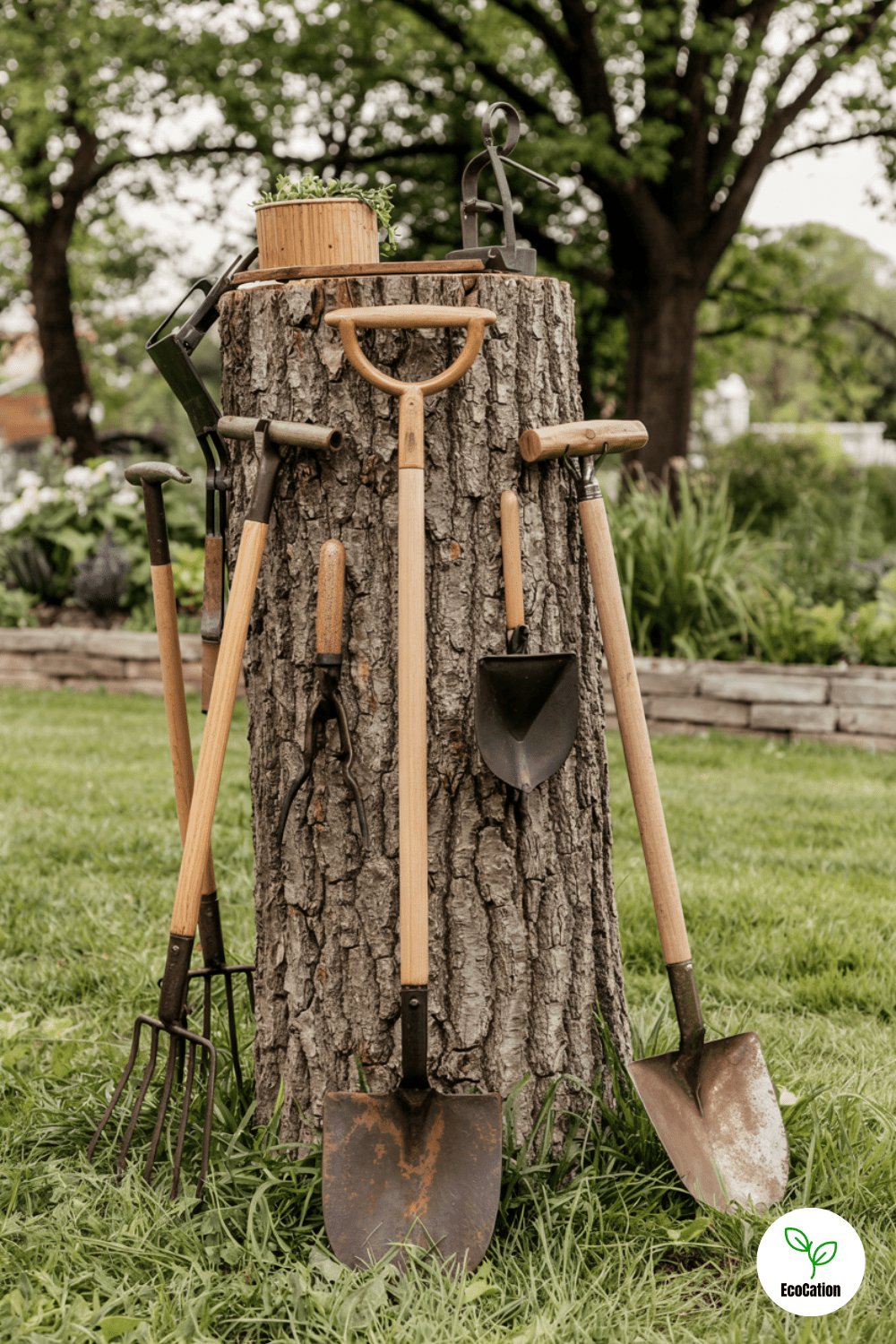 Show off your vintage tools by mounting them artistically on a tall stump. Arrange rakes, hoes, and shovels in a sunburst pattern, or hang smaller tools from hooks. This functional art piece keeps frequently used items handy while adding rustic charm to your garden shed area. Apply linseed oil to the wood annually to preserve its natural beauty.
